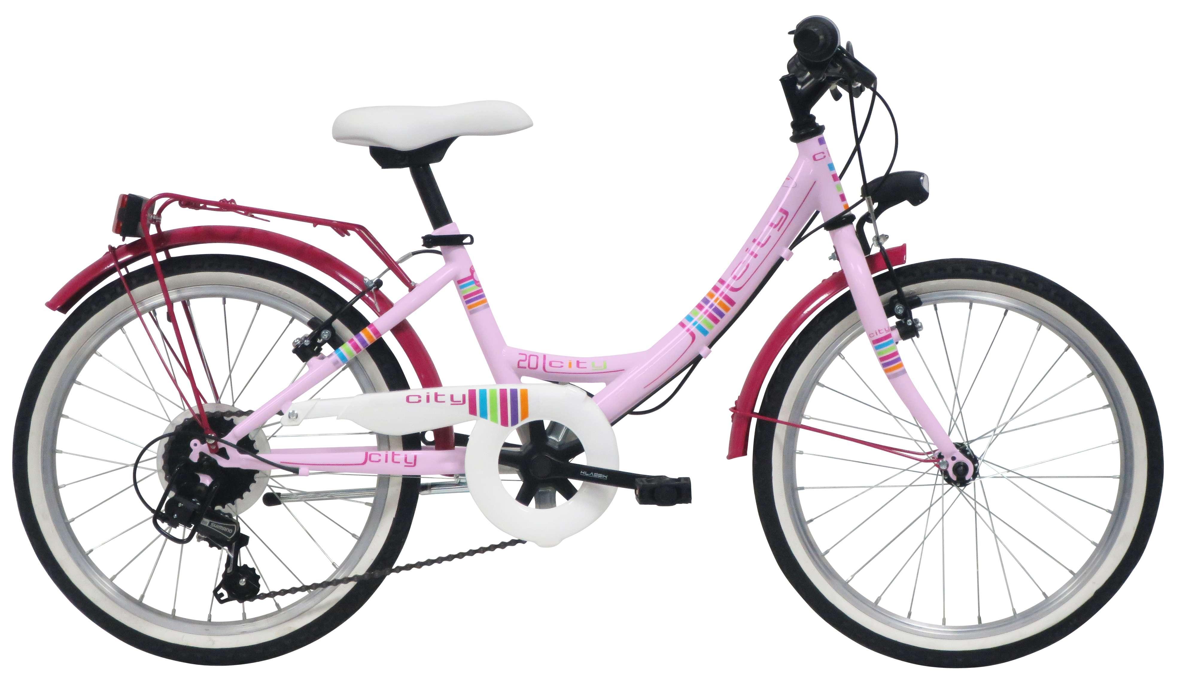VELO -VTC 20 City Fille - Cadre acier avec enjambement bas - Fourche rigide - 6 Vitesses par poignée tournante - Roue libre 6 vitesses - Dérailleur arrière Shimano TY21 - Potence plongeur - Freins V-Brake avec étriers acier & Leviers résine - Jantes aluminium & pneus noirs et blancs - Selle avec attache rapide - Gardes boue - Porte bagages - Béquille - Sonnette - Eclairage à piles fournies - livré monté à 98%