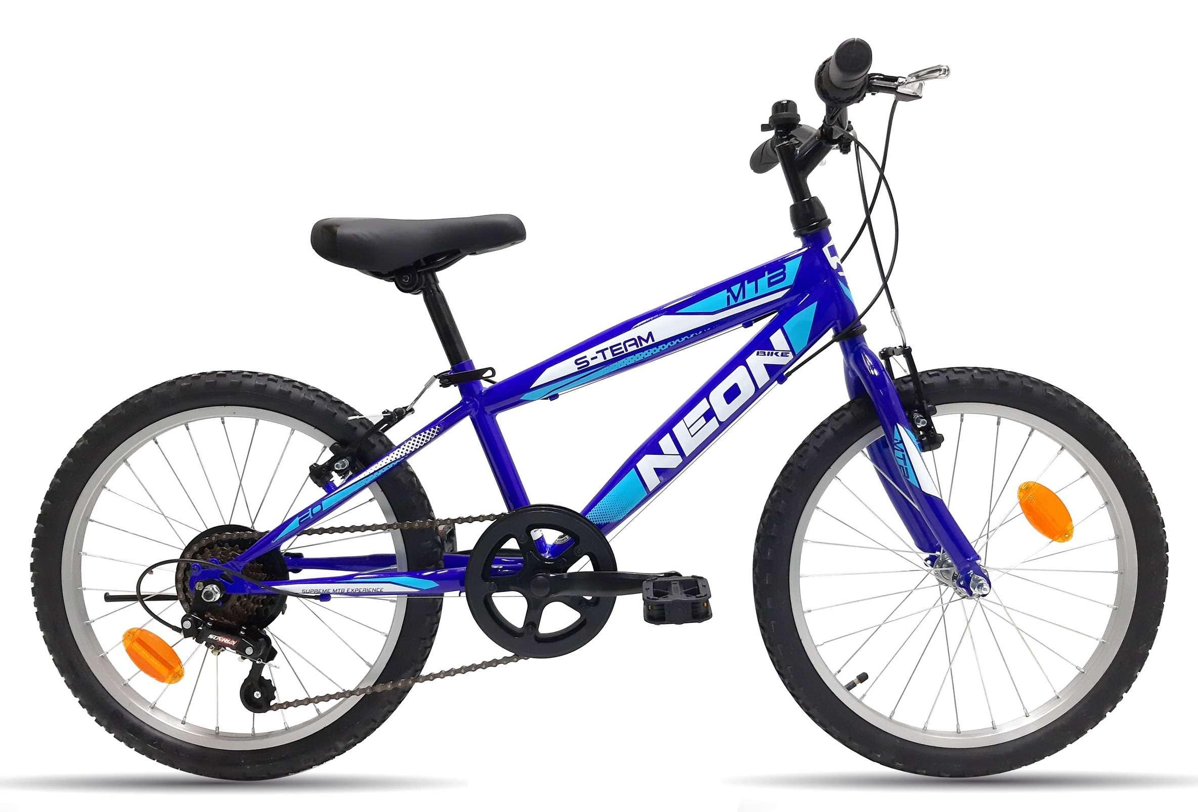 Vélo enfant 20'' NEON / S-TEAM avec cadre rigide en alliage d'acier équipé de 7 vitesses que l'on change avec une poignée tournante. Pour le freinage, vous trouverez à l'avant comme à l'arrière des freins-Brake avec des leviers en aluminum. La selle est réglable aisemment en hauteur via une attache rapide. Ce VTT est équipéd'une potence plongeur, d'une béquille arrière très pratique, de catadioptres sur les roues et sur les pédales. Enfin, les éclairages avant et arrière à LED sont fournis tout comme le marquage FNUCI.