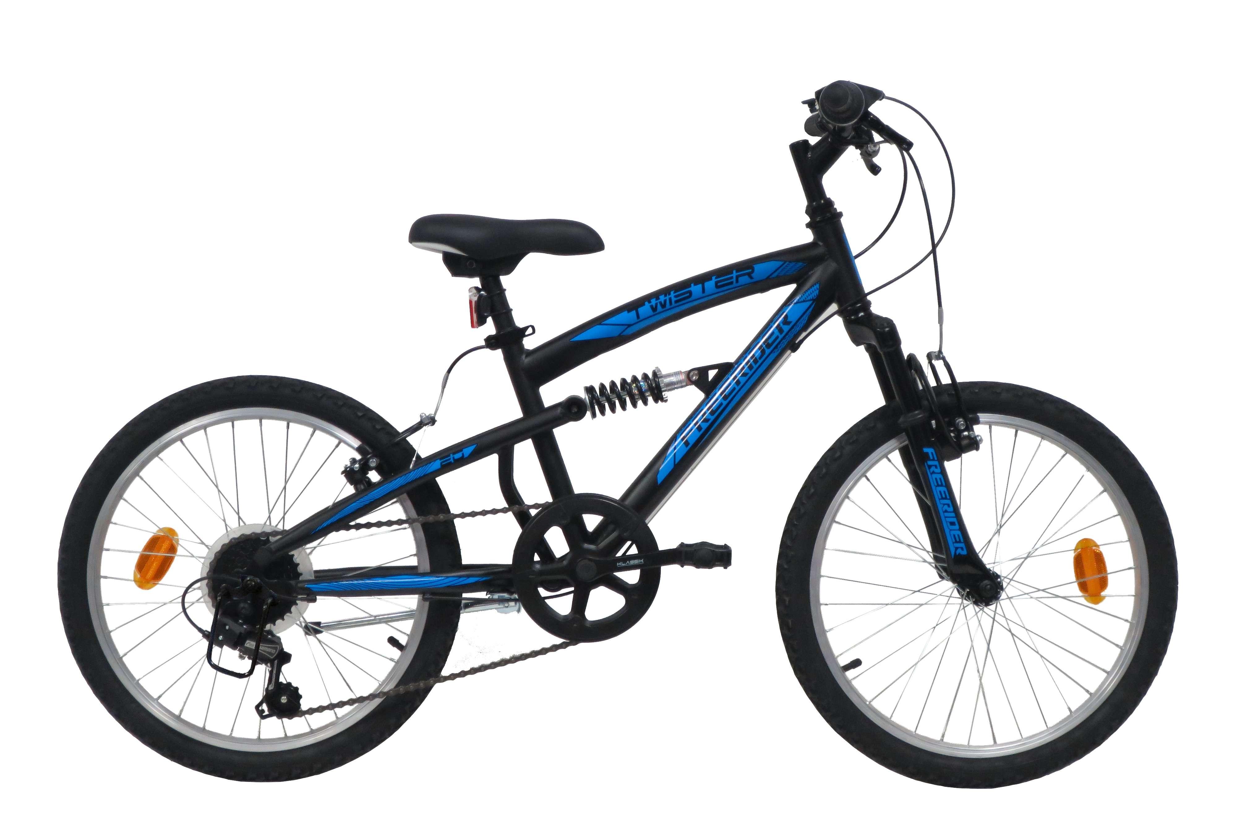 VTT 20'' Tout suspendu Garçon Twister/Freerider pour enfant de 115 à 130 cm - Cadre acier suspendu - Hauteur cadre 31 - Fourche télescopique - 6 Vitesses par poignée tournante à friction - Dérailleur arrière Shimano TY21 - Protège dérailleur - Frein avant et arrière V-brake acier & leviers en résine noire - Jantes aluminium avec attache rapide avant & pneus noirs - Béquille - Sonnette - Eclairage à piles fournies - Livré monté à 85%