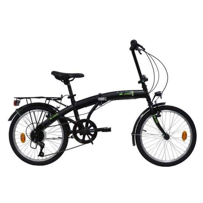 Vélo 20 Pliant Karma x-one Mixte - Cadre acier rigide - Fourche rigide - 6 vitesses indexées par poignée tournante - Dérailleur arrière Shimano TY21 - Freins avant et arrière V BRAKE avec étriers acier & Leviers en résine - Jantes aluminium & pneus noirs - Hauteur de selle et de guidon réglable - Gardes boue - Béquille - Porte bagage - Sonnette - Eclairage à piles fournies - Livré monté à 98%