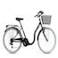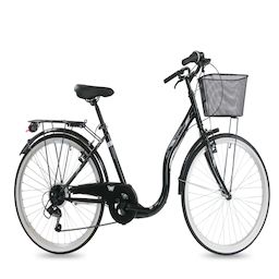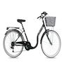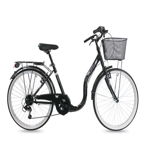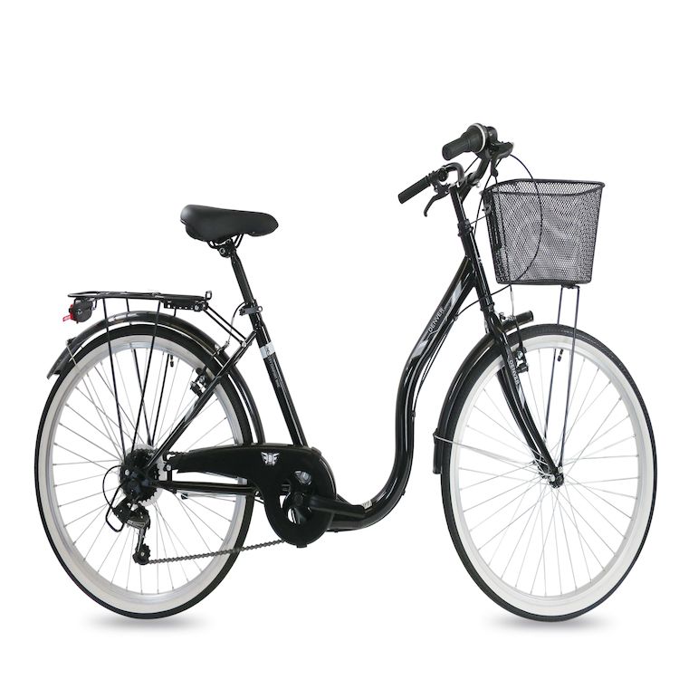 Vélo Ville 26'' avec cadre en acier avec enjambement facile - Fourche rigide - Freins V-Brake - Transmission avec dérailleur Shimano 6 vitesses et poignées tourante - Mono plateau et équipement City complet comprenant également un carter de chaine et une béquille en plus des traditionnels garde boues, porte bagages et panier avant. Ces pneus noirs et blanc lui confère un aspect vintage !