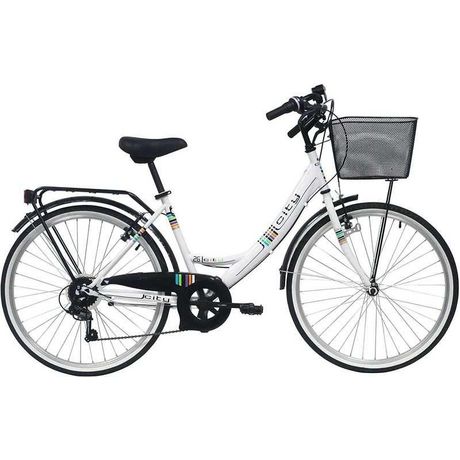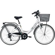 VTC 26 City Femme - Cadre acier rigide avec enjambement bas - Fourche rigide - 6 vitesses via poignée tournante friction - Roue libre 6 vitesses - Dérailleur arrière TY21 Shimano - Freins avant et arrière V BRAKE & Leviers en résine noire - Jantes aluminium & pneus noirs - Panier avant - Gardes boue - Béquille - Carter - Protège dérailleur - Porte bagages - Selle confort - Sonnette - Eclairage à Piles Fournies