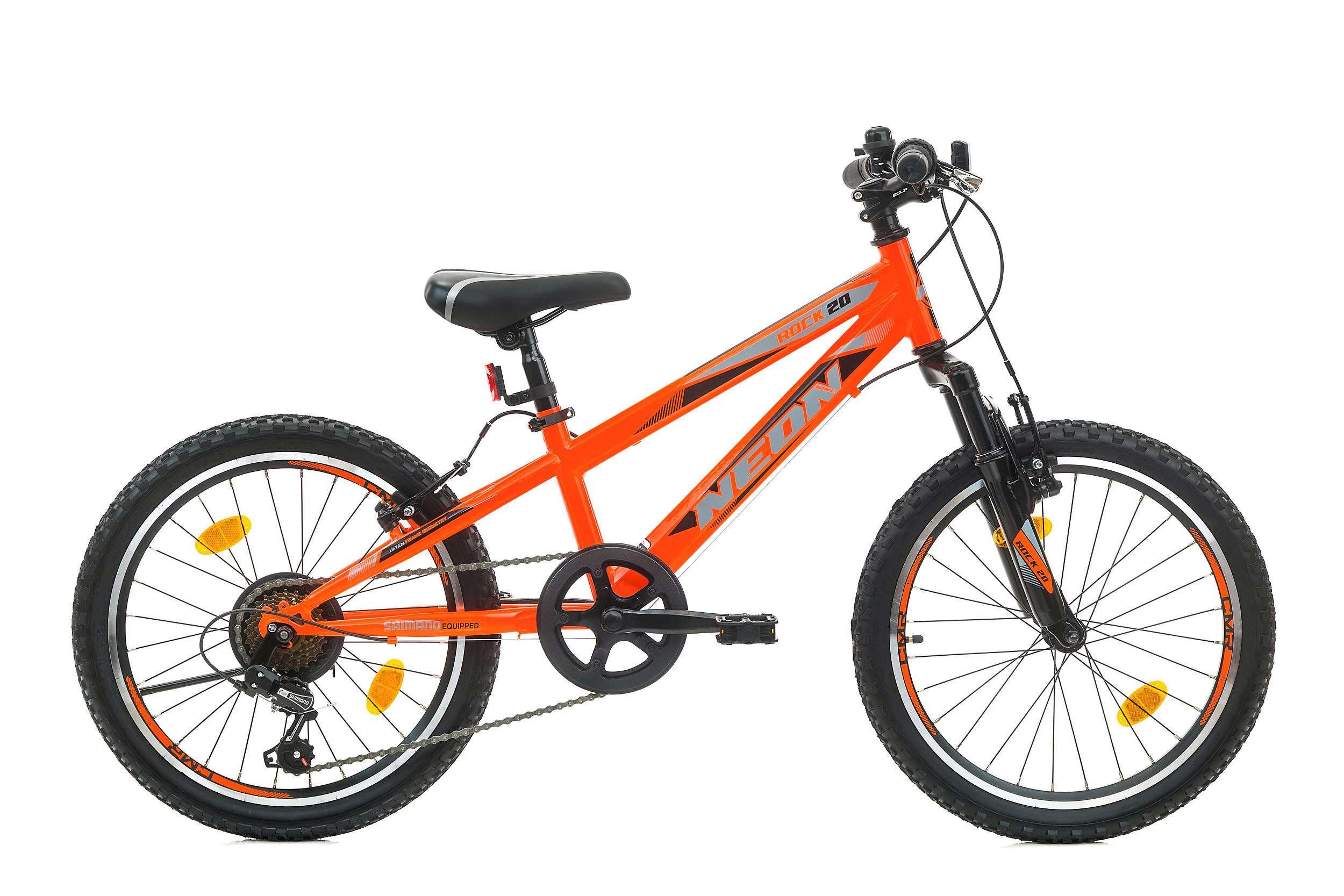 Vélo enfant VTT 20'' idéal pour un enfant de taille comprise entre 1.20m et 1.40m équipé d'une fourche téléscopique, cadre acier rigide octogonal, 7 vitesses via une poignée tournante et un dérailleur Shimano TY21 arrière, Freins V-Brake en aluminium, potence Headset, pneu noirs, selle réglable en hauteur via une attache rapide, sonnette incluse, éclairage à leds fournis, marquage FNUCI et enregistrement inclus !