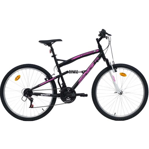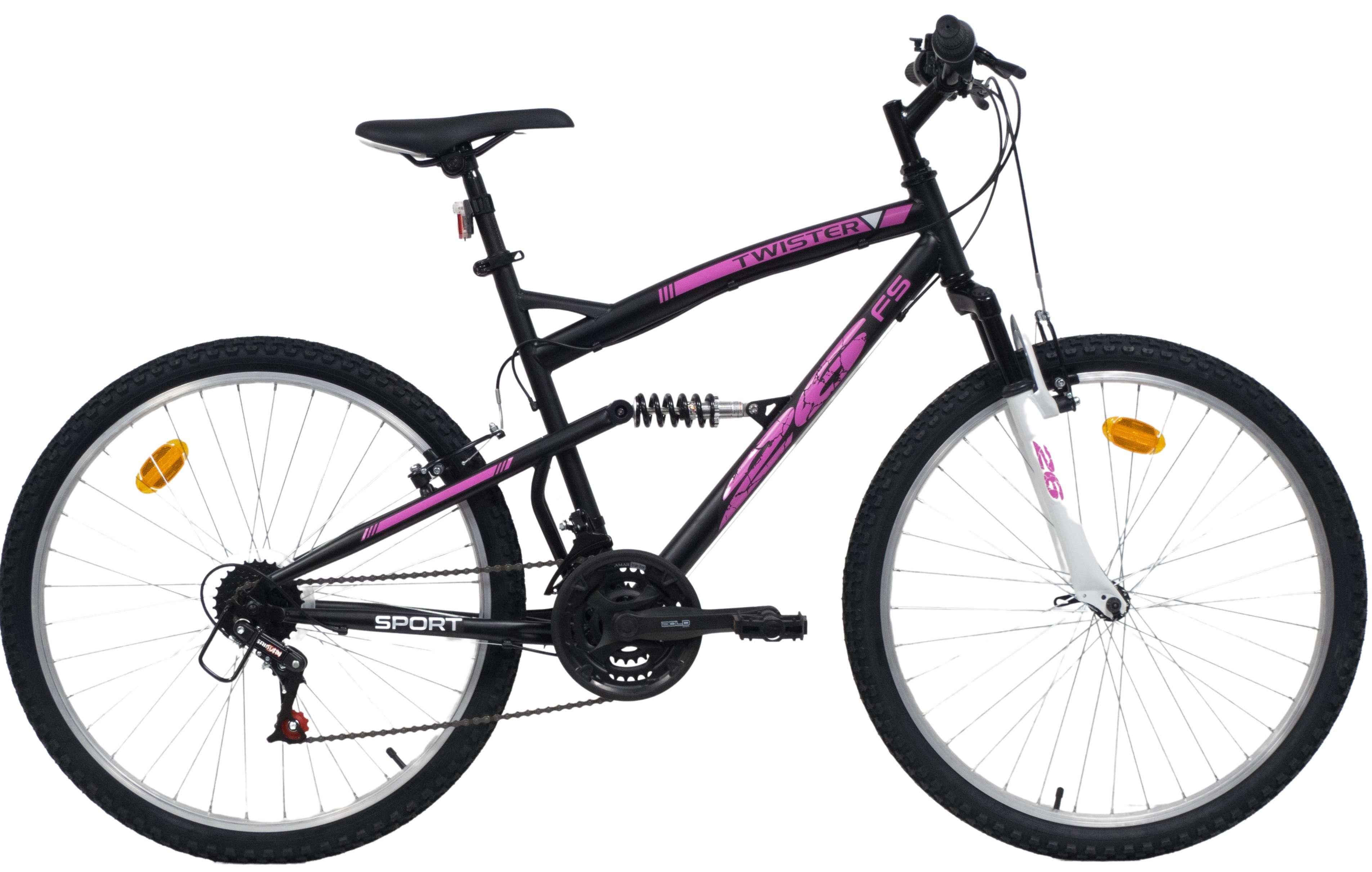 VTT 26'' Tout Suspendu Femme Twister - Cadre en acier - Fourche télescopique - 18 Vitesses par poignées tournantes - Roue libre 6 vitesses - Dérailleur arrière Indexé - Potence plongeur - Freins avant & arrière V-Brake - Jantes aluminium avec attache rapide avant - Pneus noirs - Selle avec blocag