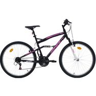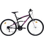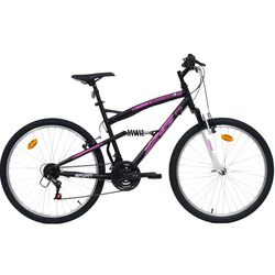 VTT 26'' Tout Suspendu Femme Twister - Cadre en acier - Fourche télescopique - 18 Vitesses par poignées tournantes - Roue libre 6 vitesses - Dérailleur arrière Indexé - Potence plongeur - Freins avant & arrière V-Brake - Jantes aluminium avec attache rapide avant - Pneus noirs - Selle avec blocage rapide - Sonnette - Eclairage à piles fournies.