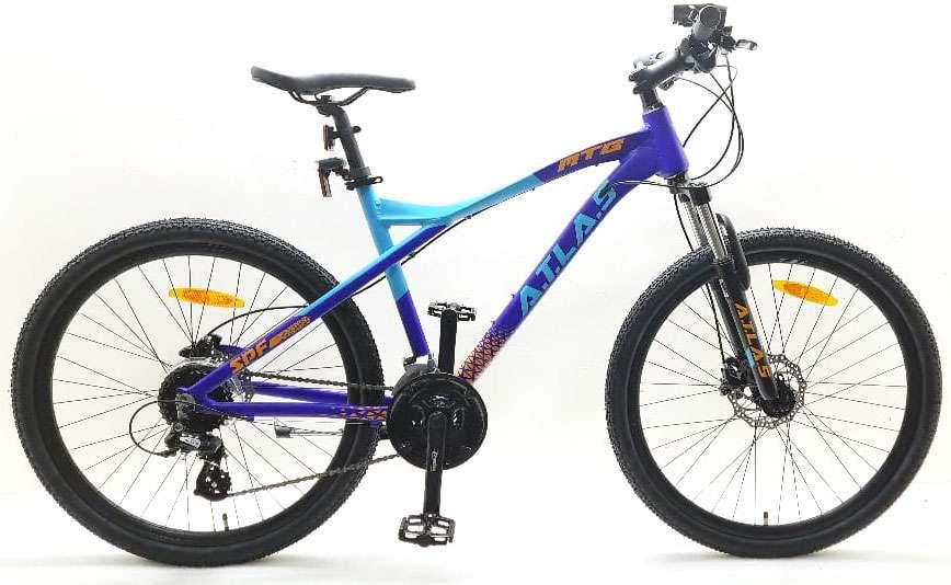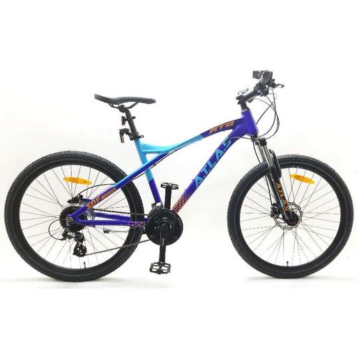 VTT 26'' rigide Atlas - Cadre rigide Aluminium - Fourche télescopique - 24 Vitesses indexées par poignées à gâchette Shimano - Roue libre 8 vitesses Shimano - Dérailleur avant et arrière Shimano Altus - Potence Head set - Frein avant et arrière à disque hydraulique - Leviers de freins en aluminium - Jantes aluminium double parois avec attache rapide avant et arrière & pneus noirs - Béquille Alu réglable - Sonnette - Eclairage à piles fournies - Taille 1.75 m - 1.85 m.