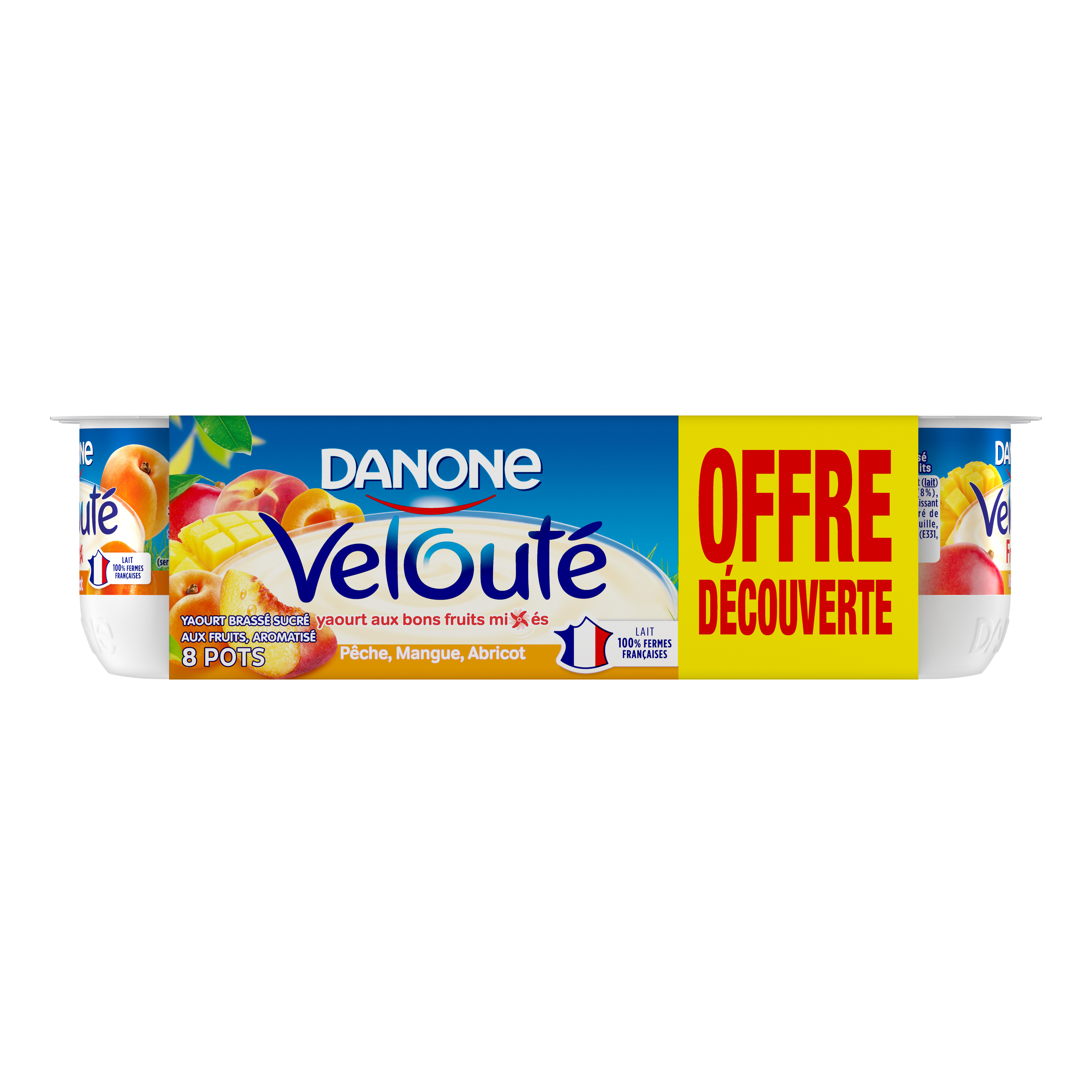 "Danone Velouté aux bons fruits mixés, c'est un yaourt brassé aux fruits à la texture onctueuse. Il est fabriqué avec des ingrédients d'origine 100% naturelle: du bon lait, un mix exclusif de ferments et une petite touche de crème. Il vous apporte tous les bienfaits du calcium et des protéines*, des nutriments essentiels pour prendre soin de vous et de ceux que vous aimez* depuis plus de 100 ans. *Le yaourt Danone Velouté aux bons fruits mixés est source de calcium, qui est nécessaire au maintien d'une ossature normale. Il est également source de protéines qui contribuent au maintien de la masse musculaire."
