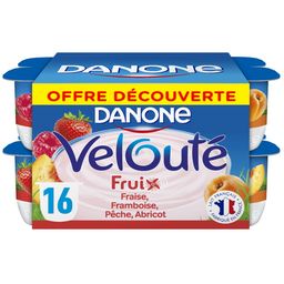 Danone Velouté Fruix fraise, framboise, pêche, abricot, est un yaourt aux fruits brassé avec de bons fruits, des ferments ainsi que du bon lait entier et une touche de crème, tous deux origine France. Ce yaourt aux fruits mixés, à la texture lisse et onctueuse est sans colorants artificiels* ni conservateurs et conçu dans notre laiterie de Villecomtal (32) ou St-Just-Chaleyssin (38)!