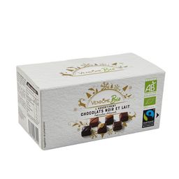 Assortiment de bonbons de chocolats enrobés de chocolat au lait (11.7%) et de chocolat noir (12%) issus de l'agriculture biologique. Production certifiée par FR-BIO-10. Distribution certifiée par FR-BIO-01.