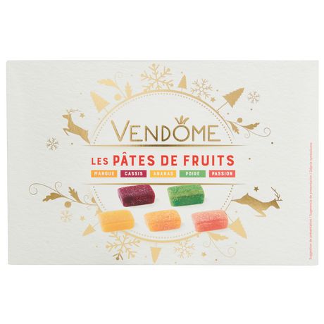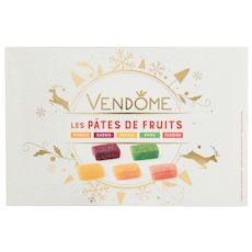 Régalez-vous avec la collection festive Vendôme qui vous propose 5 parfums de pâtes de fruits fabriquées en France : mangue, cassis, ananas, poire, passion