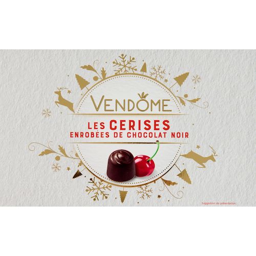 Ingrédients : Sucre, pâte de cacao, cerises à l’alcool 16% (cerises, eau, alcool), sirop de glucose, beurre de cacao, sirop de sucre inverti, alcool 2%, jus de cerises alcoolisé sucré (eau, alcool, sucre, jus de cerise), émulsifiant : lécithines (SOJA), matière grasse de LAIT anhydre. Traces éventuelles de fruits à coque, de céréales contenant du gluten et d'oeufs. Cacao dans le chocolat noir : 49% minimum Elaboré à partir de lait origine UE et/ou non UE.