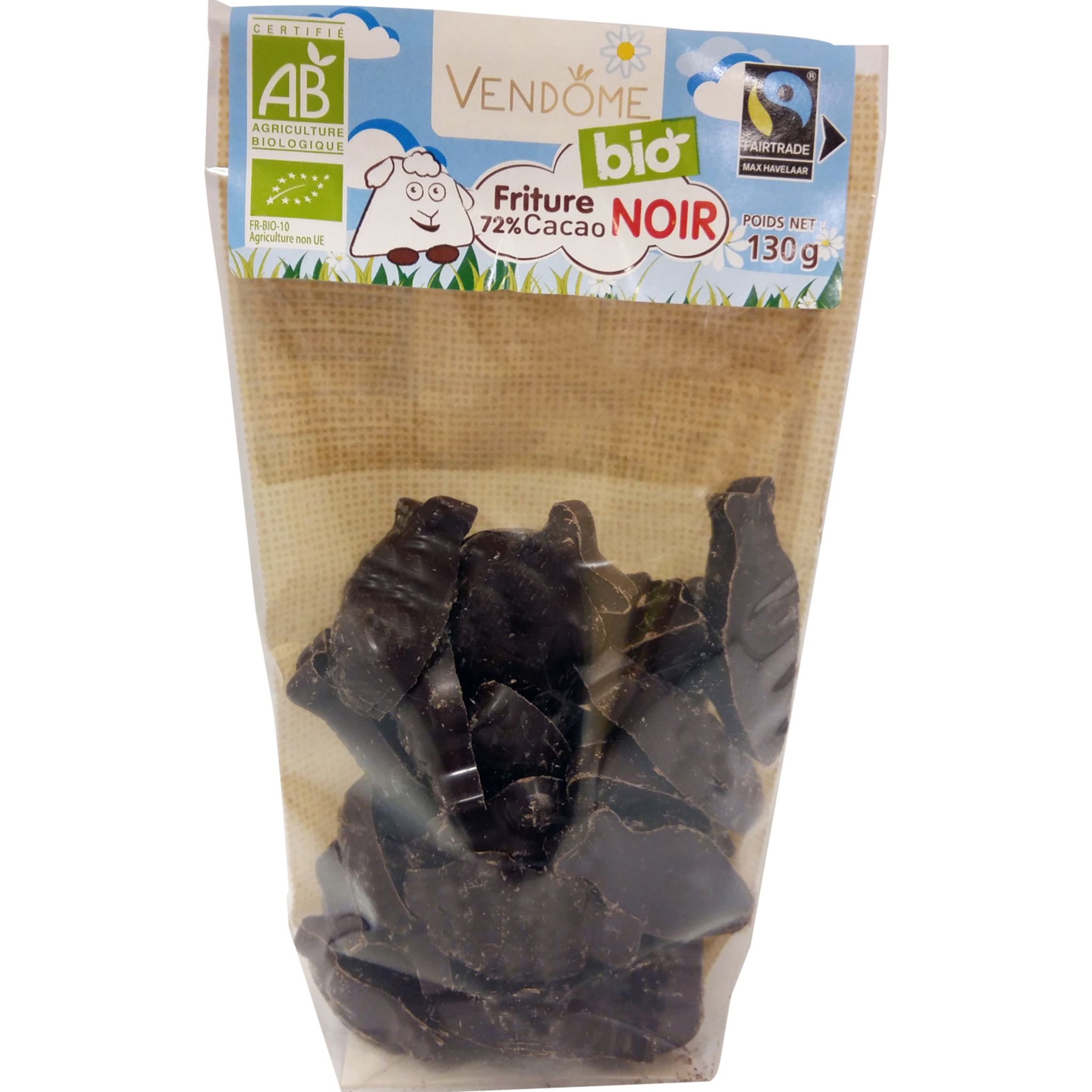 Fritures de chocolat noir 72% de cacao issues de l'Agriculture Biologique et du Commerce Equitable. Production certifiée par FR-BIO-10. Distribution certifiée par FR-BIO-01.