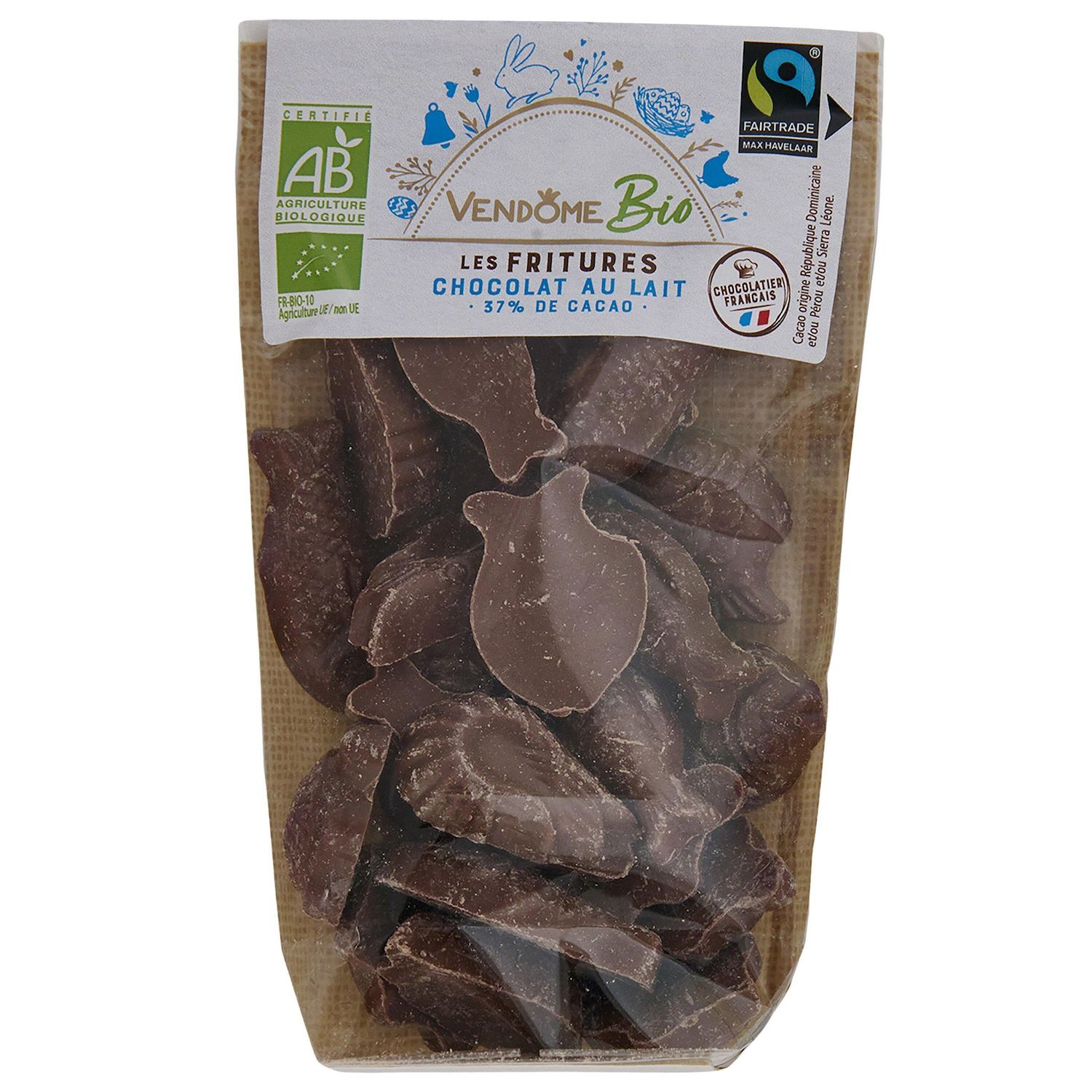 Fritures en chocolat au lait 37% de cacao issues de l'Agriculture Biologique et du Commerce Equitable. Production certifiée par FR-BIO-10. Distribution certifiée par FR-BIO-01.