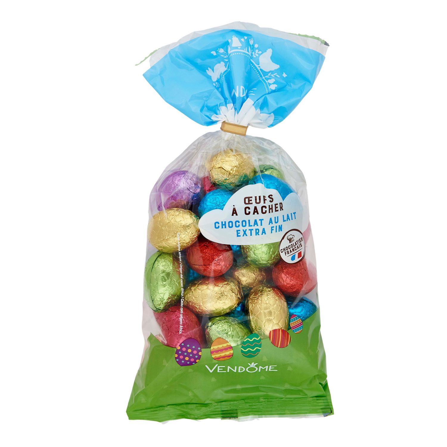 Un gros sachet d’oeufs au chocolat au lait à cacher dans le jardin ! Les emballages sont colorés pour plus de fun !