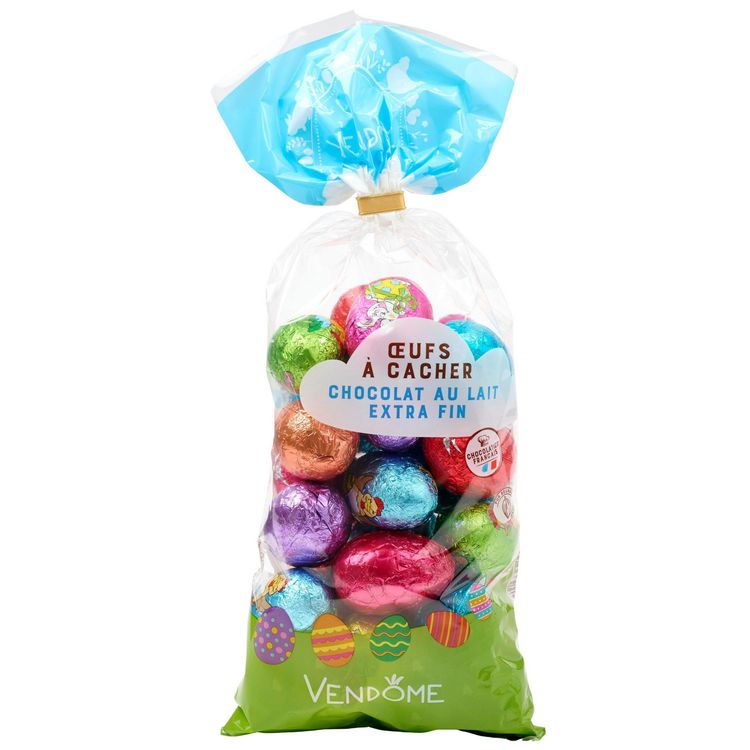 Un gros sachet d’oeufs au chocolat au lait à cacher dans le jardin ! Les emballages sont colorés pour plus de fun !