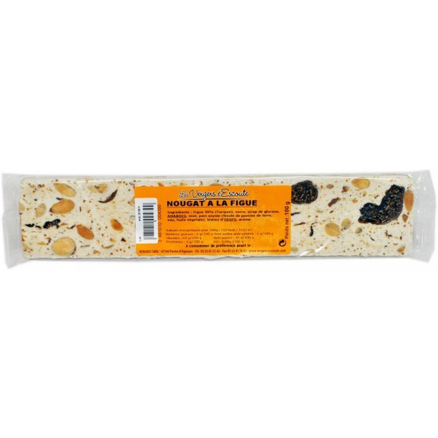 Ingrédients : Figue (30%), sucre, sirop de glucose, AMANDES, miel, pain azyme (fécule de pomme de terre, eau, huile végétale), blanc d'OEUF, arôme. *Figue : Figue sèche