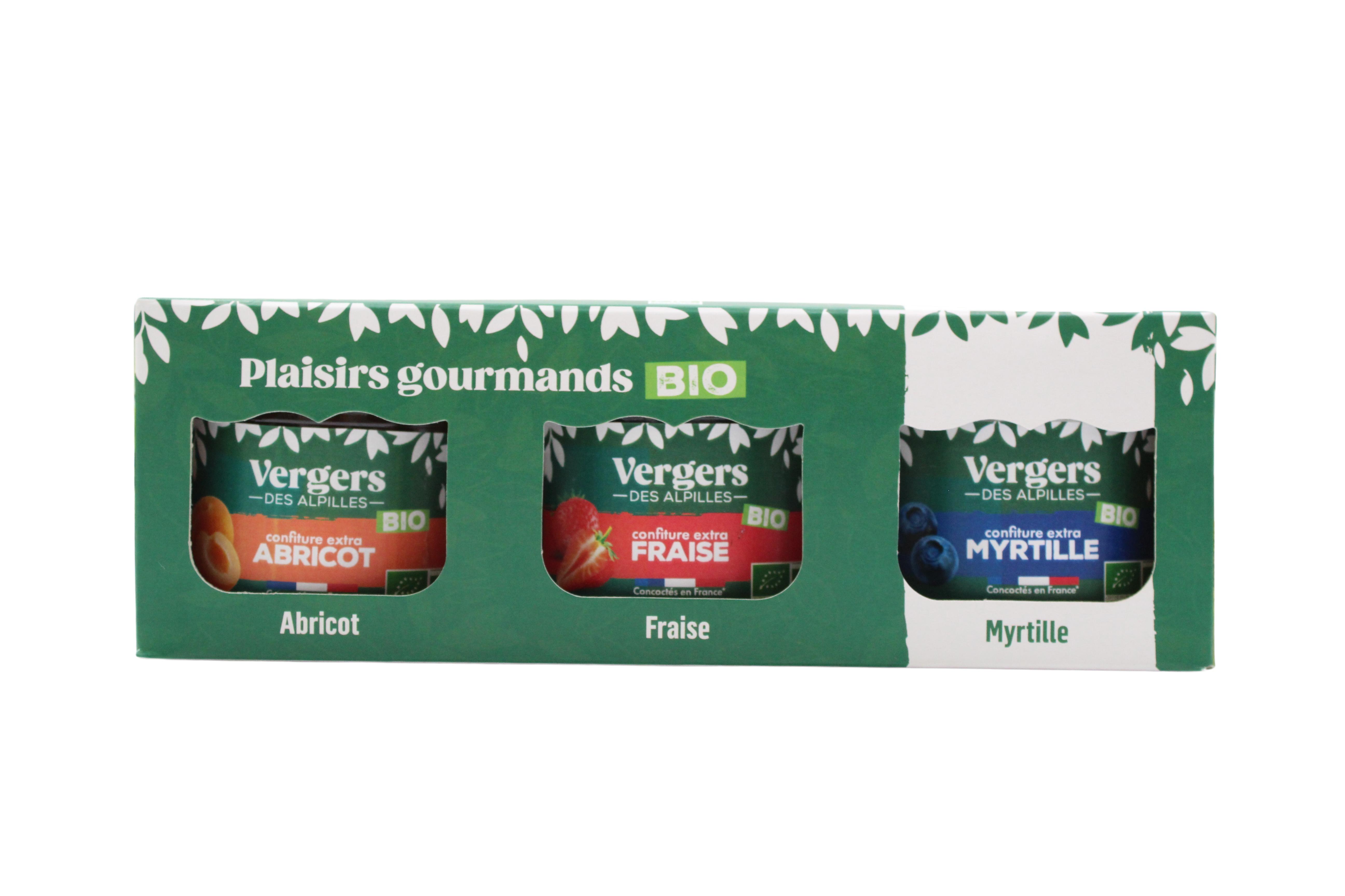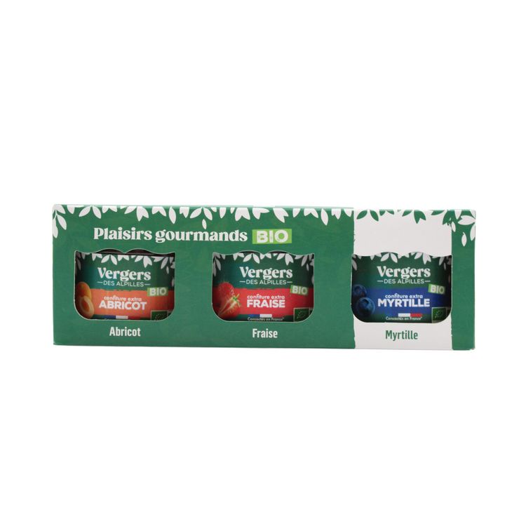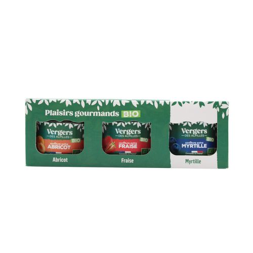 Coffret confiture extra tri-parfum abricot fraise myrtille bio