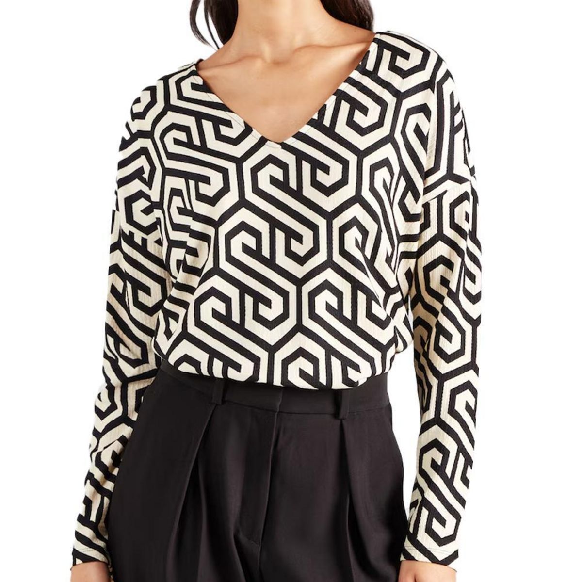 Craquez pour la blouse de la marque VERO MODA !Coloris : Noir/Beige Col V Manches longues Tissu imprimé Coupe Loose Composition : 1% Élasthanne, 99% Polyester