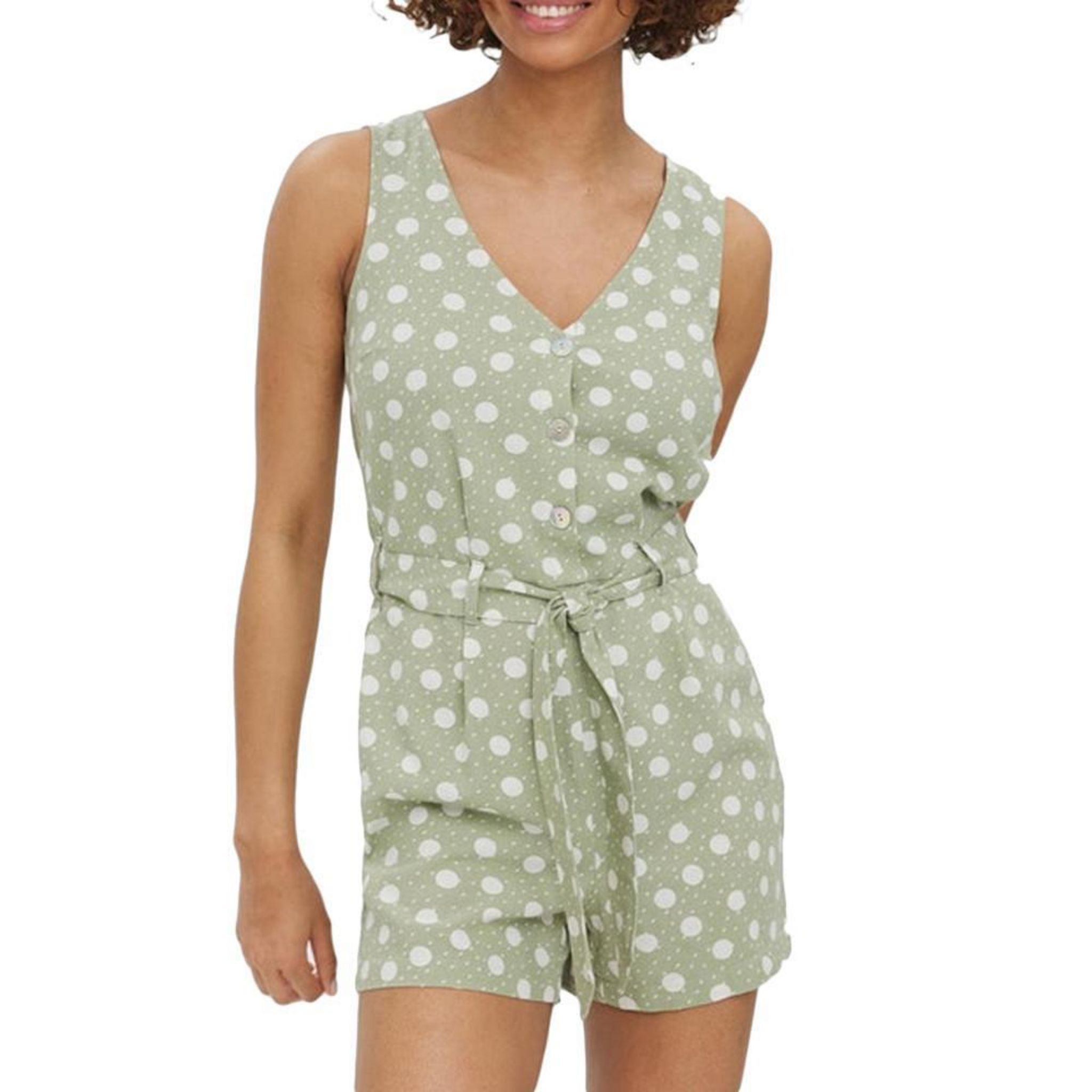 Craquez pour la combi-short de la marque VERO MODA Coloris : vert Col V Fermeture avant à boutons Ceinture nouée à la taille Sans manches Composition : 55% viscose, 45% lin