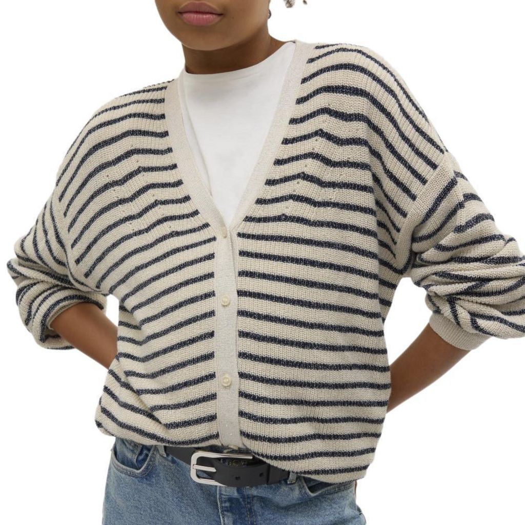Optez pour le gilet fille Vero Moda !Manches longuesFermeture à boutonsRayuresMaille brillanteCol VComposition : 43% viscose , 21% acrylique , 15% fibres métalliques
