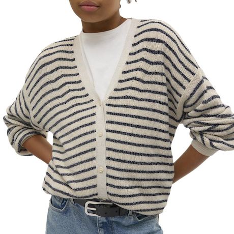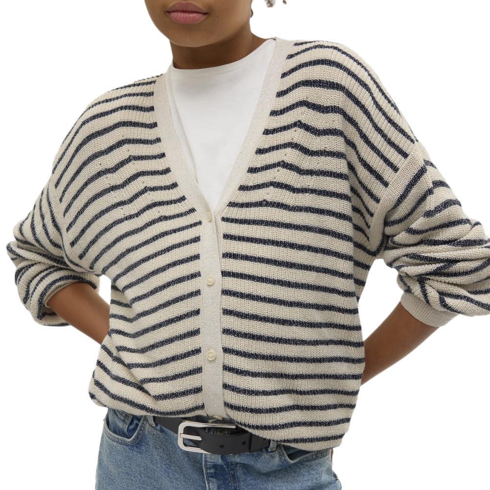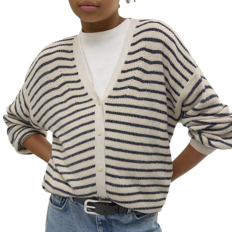 Optez pour le gilet fille Vero Moda !- Manches longues- Fermeture à boutons- Rayures- Maille brillante- Col V- Composition : 43% viscose , 21% acrylique , 15% fibres métalliques