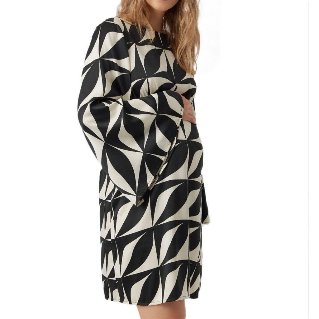 Craquez pour la robe de maternité de la marque VERO MODA MATERNITY !Coloris : Noir/Beige Col rond Manche longues et large Tissu imprimé Coupe standard fit Ligne de découpe au dessus du ventre Composition : 100% Polyester