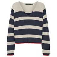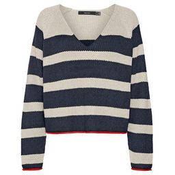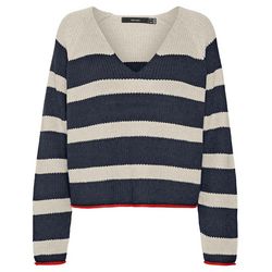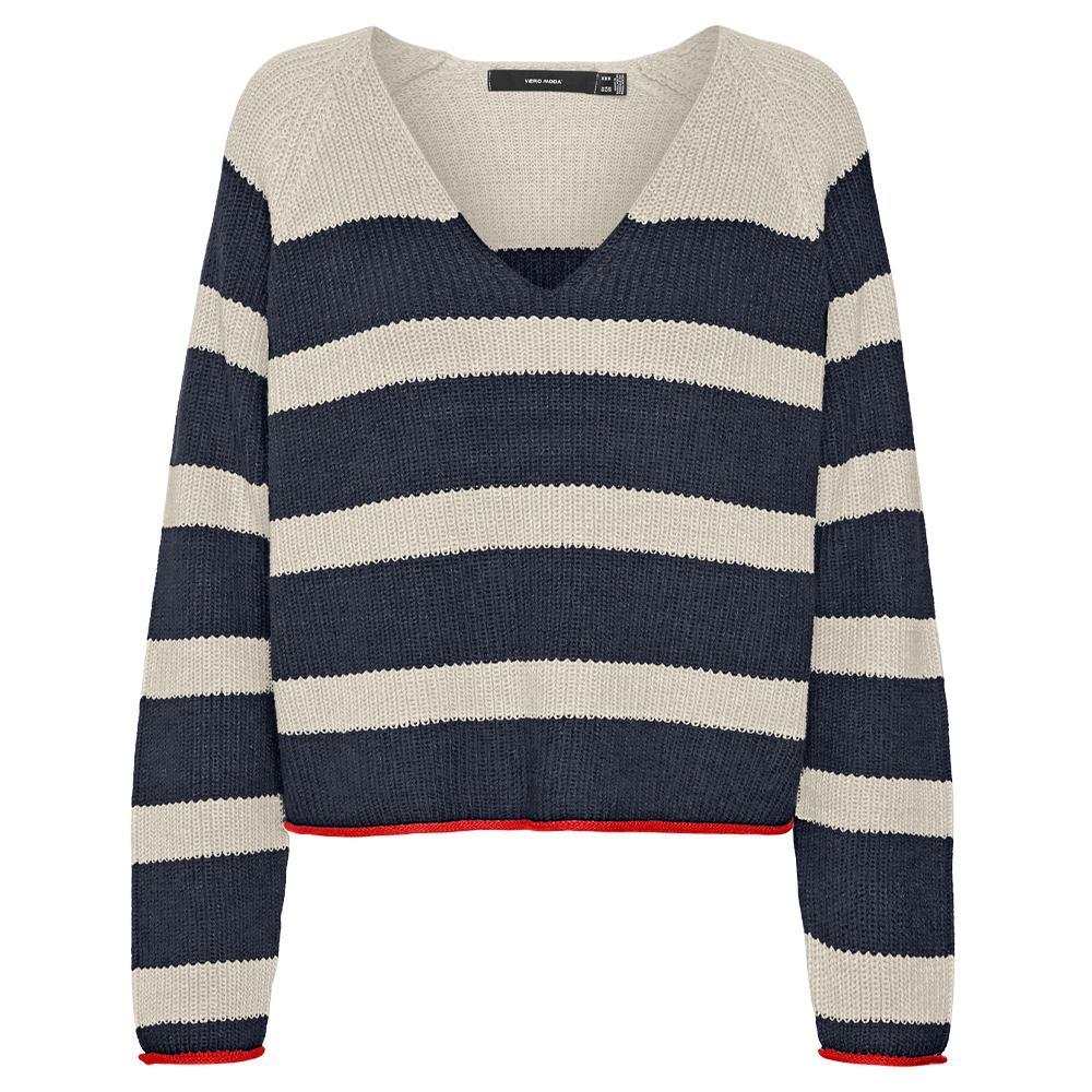 Pull femme de la marque Vero Moda !Manches longuesCol VColoris : Marine/EcruRayuresMailleComposition :40% acrylique , 36% polyester , 24% coton