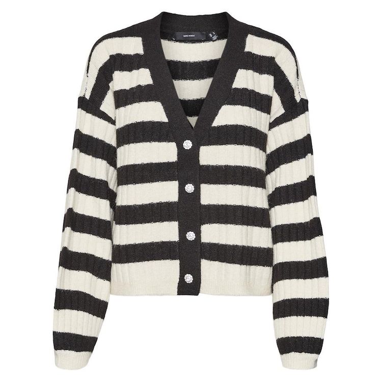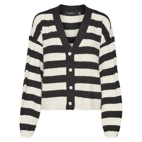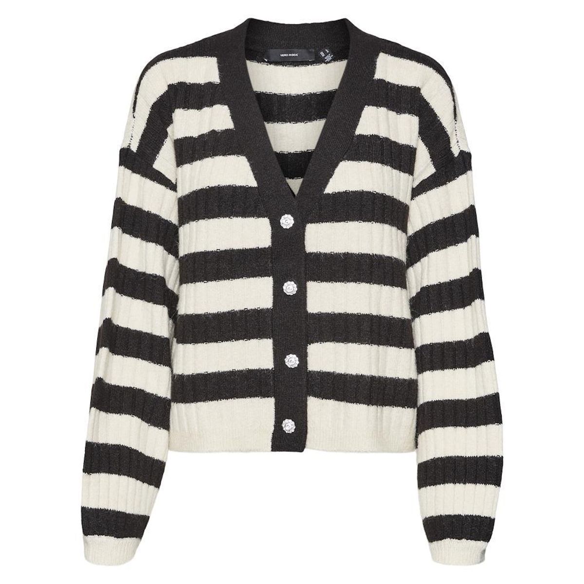 Craquez pour le Cardigan de la marque Vero Moda !Coloris : Blanc/Noir Col rond Manches longues Rayures Boutons fantaisie Composition : Polyester : 78%, Acrylique : 19%
