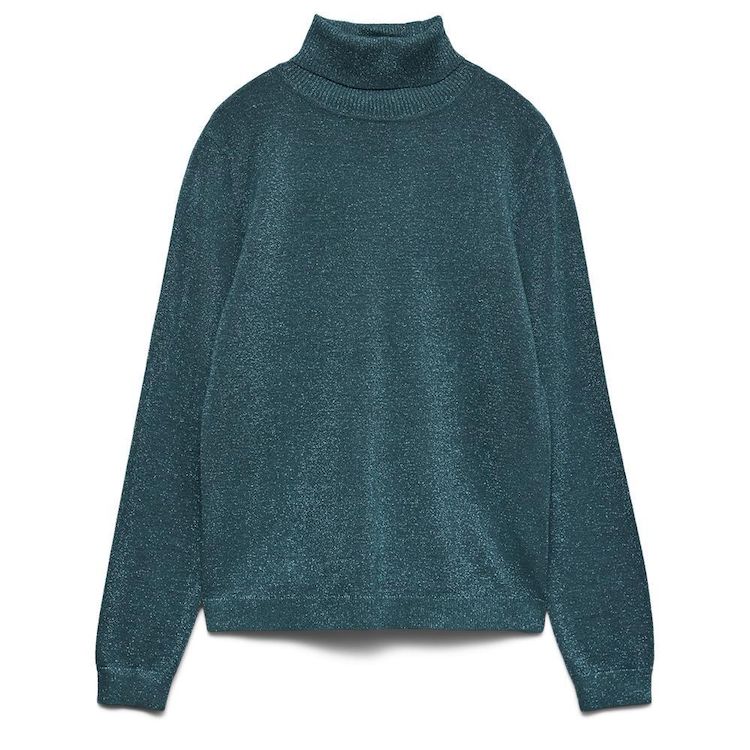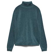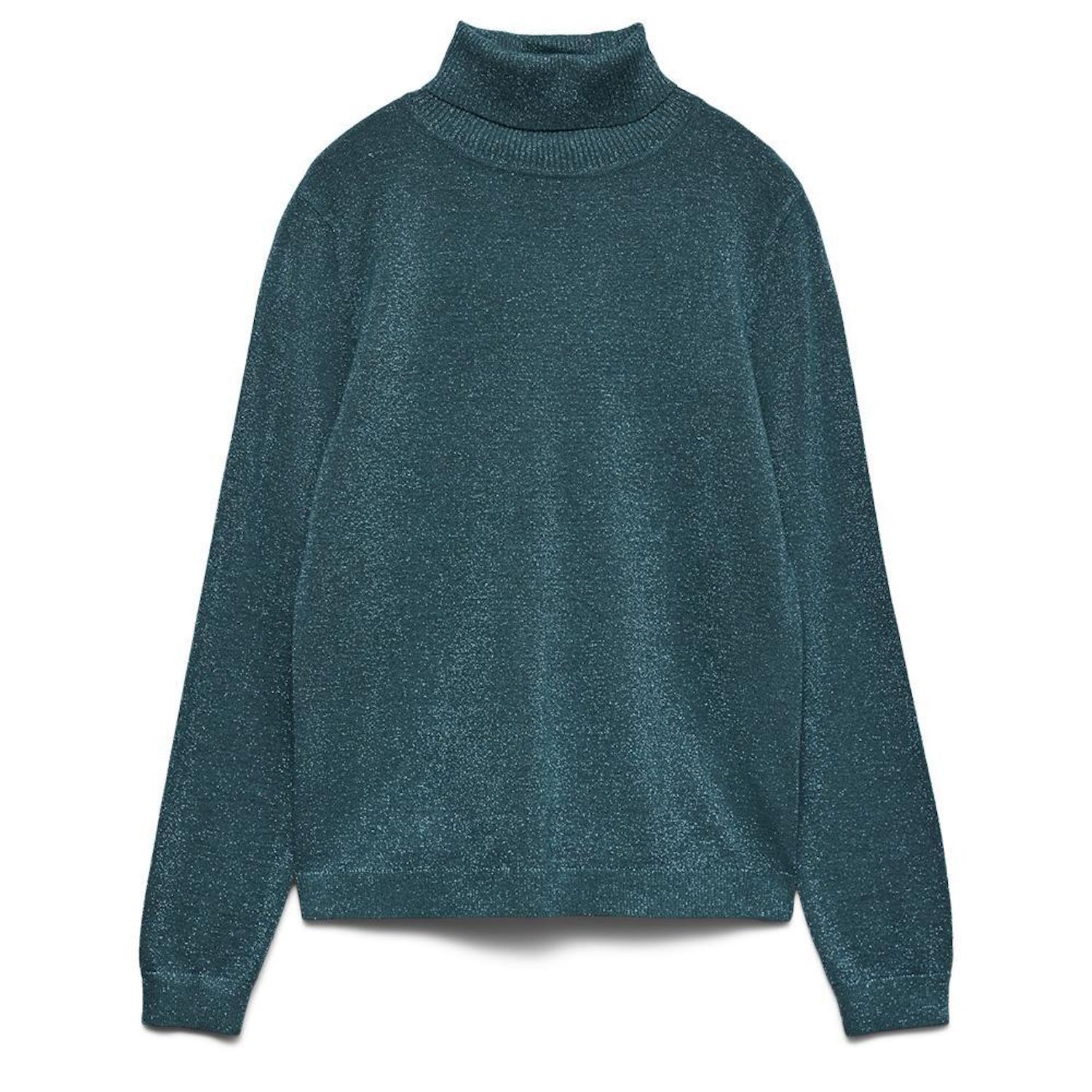 Optez pour le pull femme de la marque Vero Moda !Manches longuesCol rouléColoris : Bleu CanardMaille fine et brillanteComposition : 41% viscose , 36% polyester , 16% nylon , 7% fibres métalliques