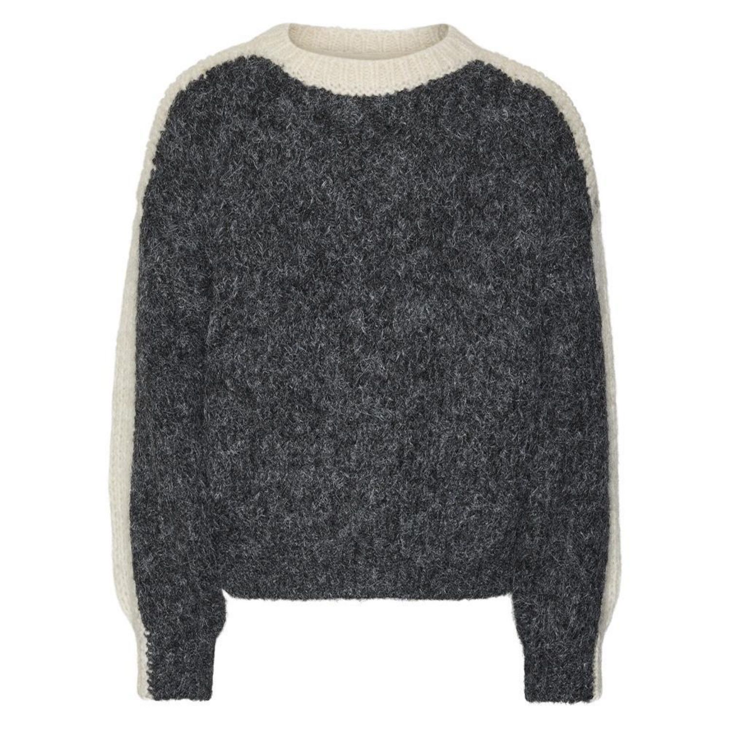 Pull fille de la marque Vero Moda !Manches longuesCol rondColoris : Gris/EcruMailleComposition : 50% Polyester recyclé , 21% Acrylique, 19% Laine , 10% Alpaca