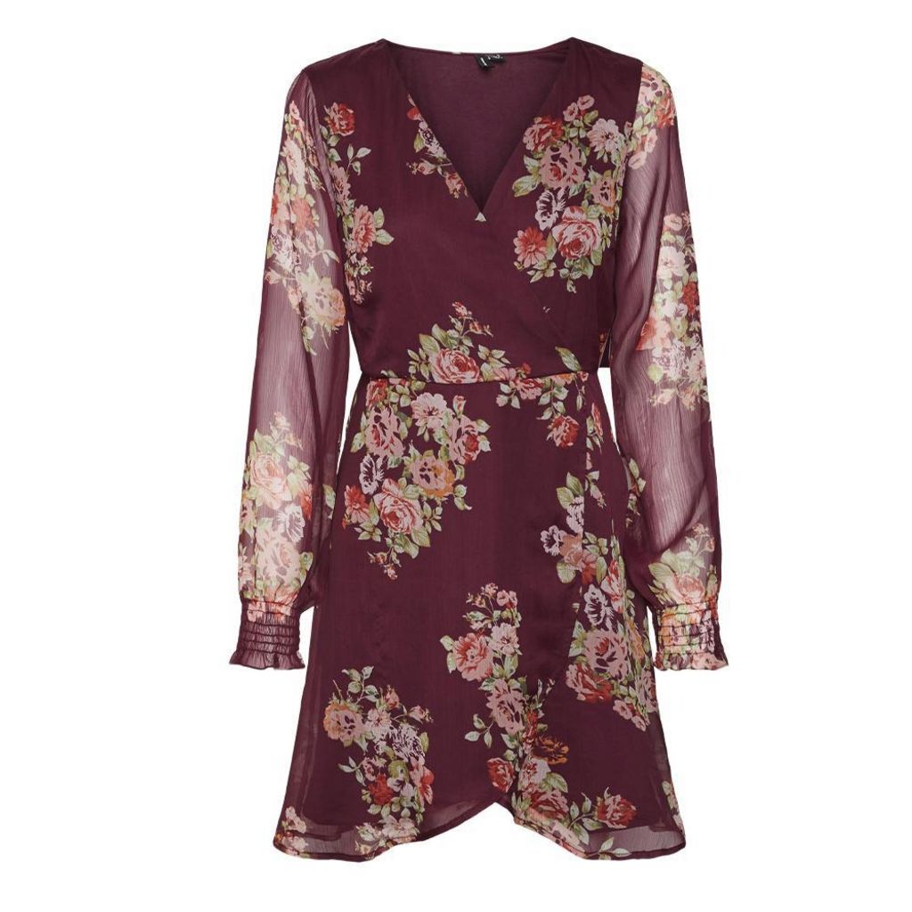 Craquez pour la robe femme de la marque Vero ModaManches longuesCol VElastique à la tailleColoris : Bordeaux FleursComposition : 100% polyester