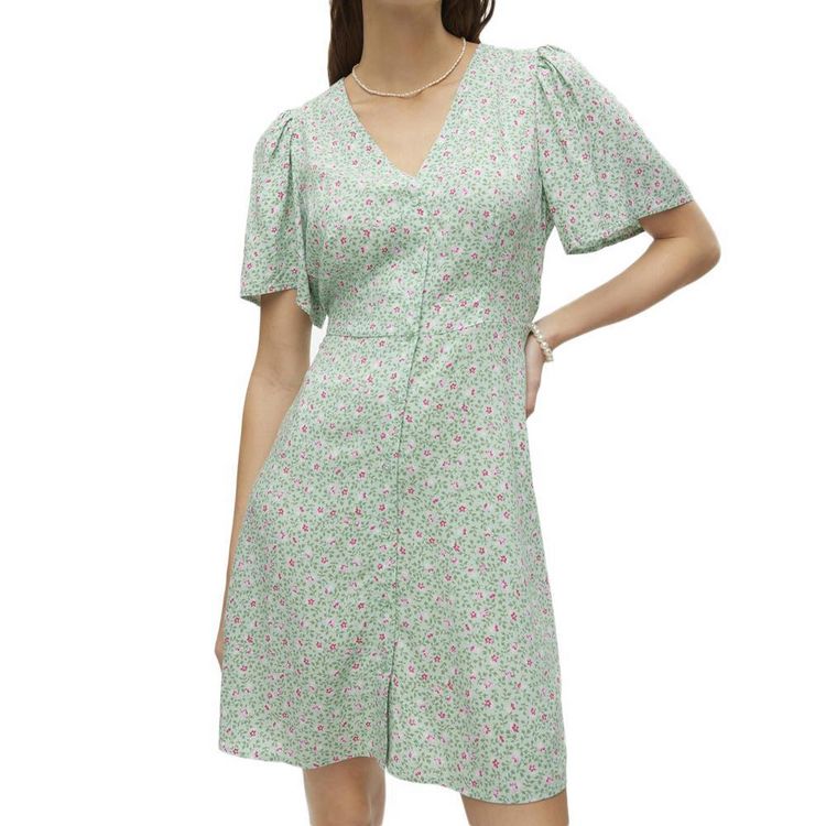 Craquez pour la robe de la marque VERO MODA !Coloris : Vert Col V Manches courtes Tissu imprimé Motif : fleursComposition : 100% viscose