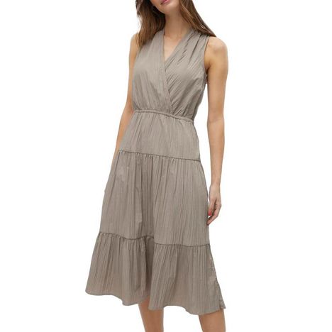 Craquez pour la robe de la marque VERO MODA !Coloris : Marron Longueur midiCoupe ample sous la poitrineCol en V sur le devantDécolleté V au dos avec liens au couSans manchesÉpaules froncéesJupe évasée à volantsTissu structuréComposition : 85 % polyester, 15 % coton.