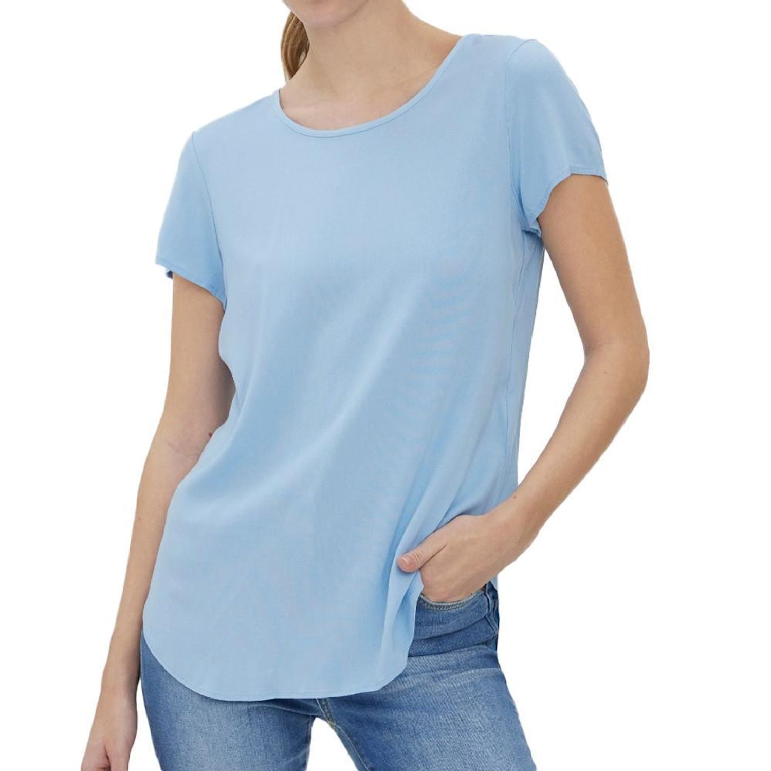 Craquez pour le T-shirt de la marque Vero Moda- Coloris : Bleu- Manches courtes- Col rond- Ourlet / bord surpiqué- Coupe droite- 97% Viscose 3% élasthanne