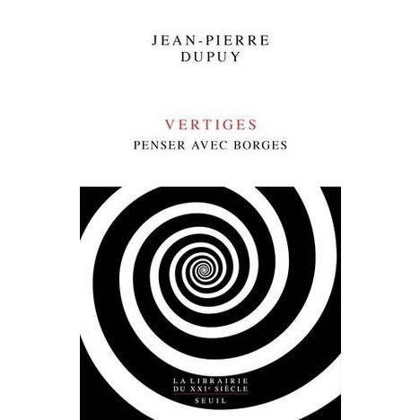 Borges est tous les hommes, et chaque homme est tous les hommes et Borges. Adolescent, Jean-Pierre Dupuy a découvert Borges, un auteur qu'il n'a cessé de relire. S'il retrouve l'écrivain argentin dam ce livre, ce n'est pas seulement pour commenter son oeuvre, mais bien pour traverser avec lui ses questionnements scientifiques comme littéraires et refuser les frontières entre les différents champs du savoir - sciences, littérature, économie, politique. Vertiges, tissu de récits, contes et lectures, est construit selon une hiérarchie enchevêtrée , nous conduisant de Tchernobyl aux élections états-uniennes, de Vertigo à la série Lost, de chameaux à la question de l'impuissance, sexuelle comme créative. la réflexion se déploie à partir de la notion de point fixe , commentée de chapitre en chapitre.
