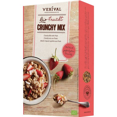 Grappes de céréales croquantes à base d'avoine et de croustillants de riz - élaborées à la main et cuites à l'huile de tournesol (sans huile de palme !) au Tyrol. Agrémentées au miel, avec des raisins de Smyrne, chips de noix de coco, abricots, griottes, fruits des bois et noisettes délicatement grillées. Mais également un soupçon de fleurs de bleuets et de tournesol. Croustillant et entièrement bio. Bonjour ! Muesli croustillant suprême aux Fruits