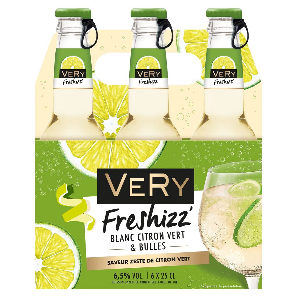 VERY FRESHIZZ CITRON VERT EST ISSU DU MARIAGE HARMONIEUX ENTRE LE VIN BLANC ET LE CITRON VERT ASSOCIE A UNE FINE BULLE POUR LA LEGERTE