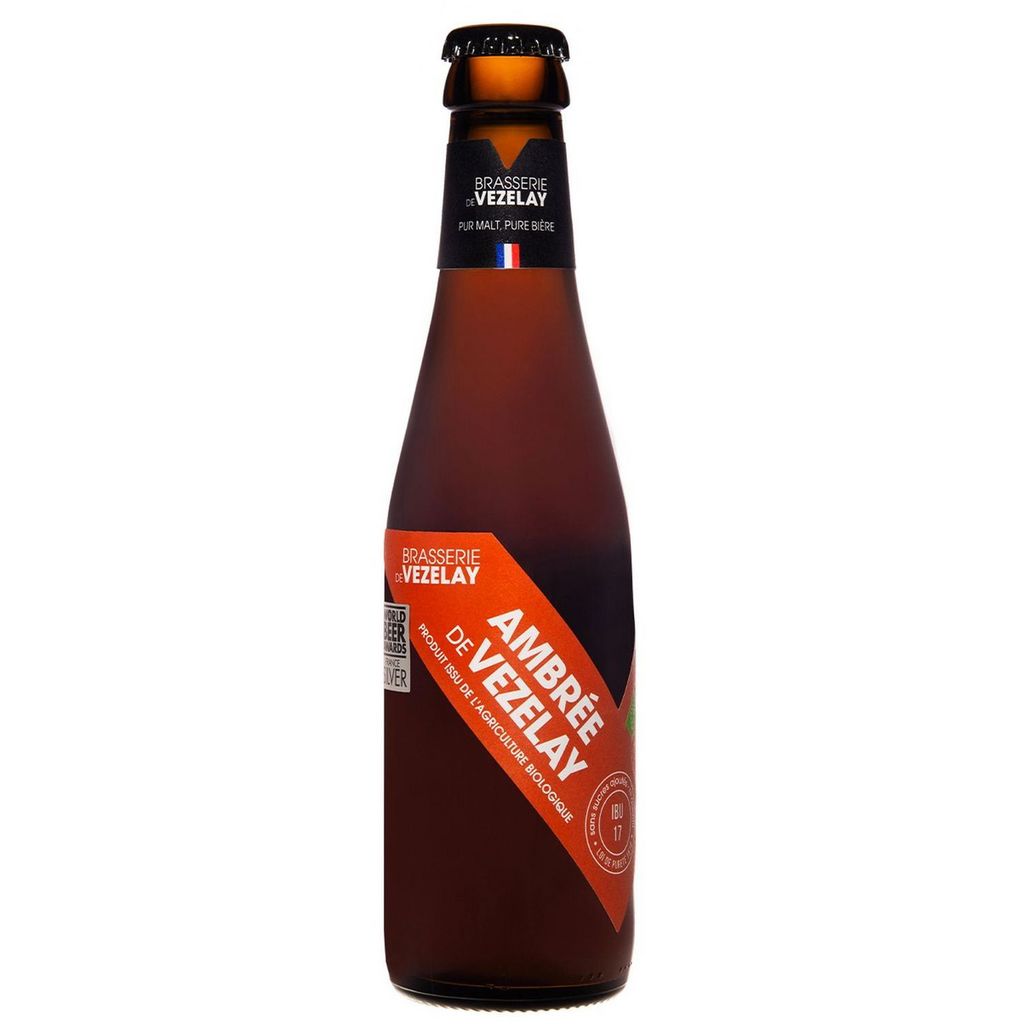Bière de Vezelay ambrée bio pur malt 25cl 5.6% alc. L'ambrée bio de Vezelay dégage des arômes d'agrumes et de pain d'épices. C'est notre bière douce et gourmande. 5,6% alc. IBU : 17