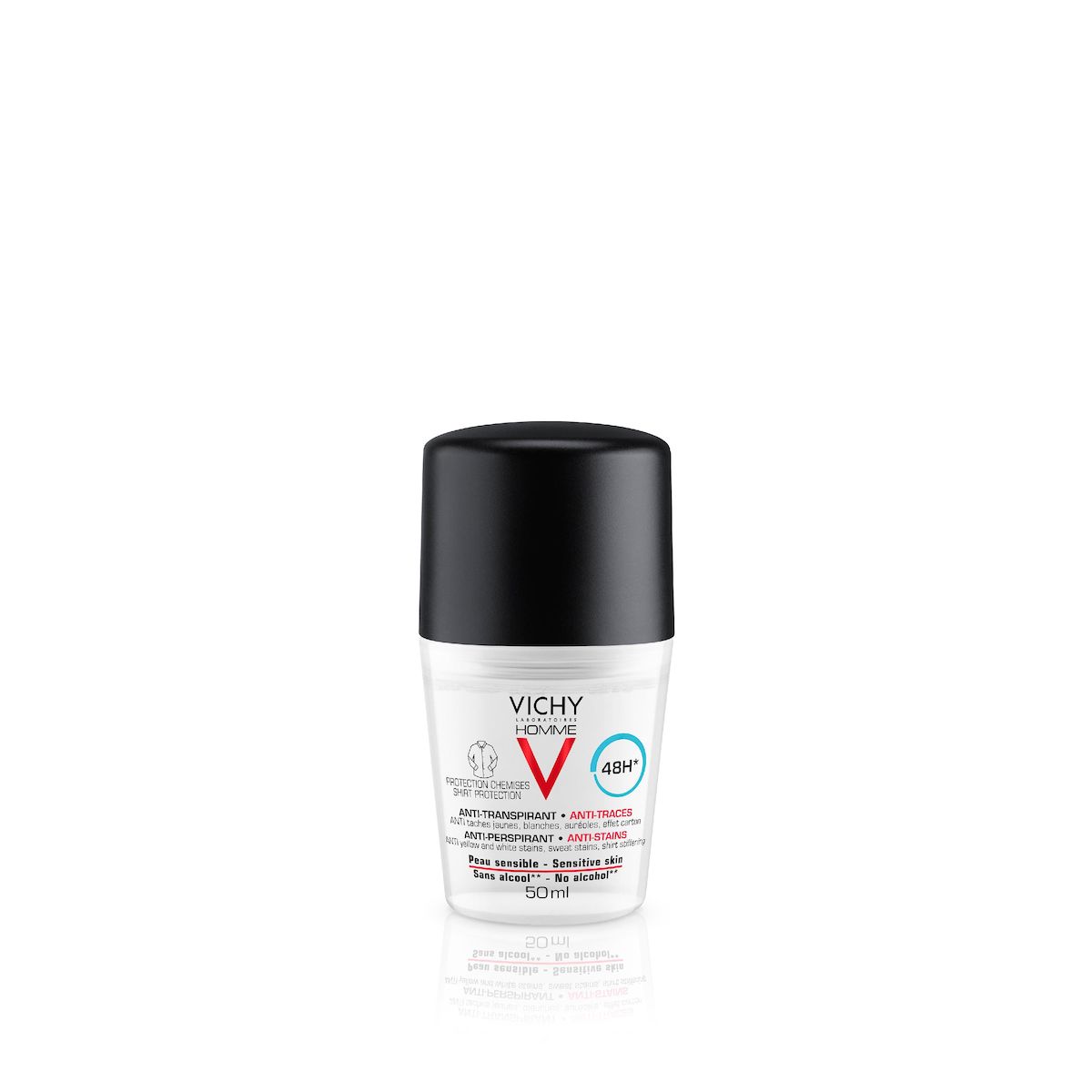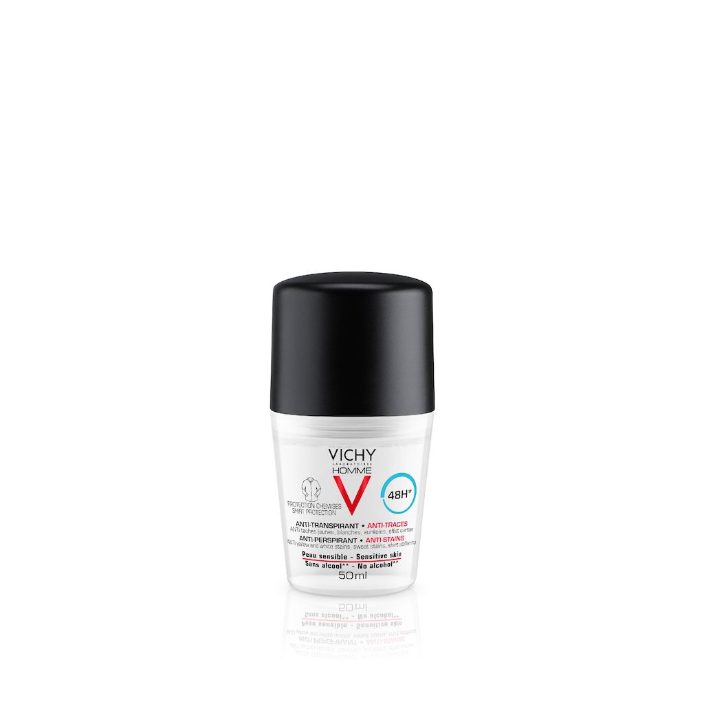 1/3 des hommes sont gênés par les traces laissées sur leurs vêtements. VICHY HOMME répond à ce besoin en créant le nouveau DEODORANT anti transpirant anti-traces protection chemise invisible pendant 48H* offrant une efficacité ANTI-taches jaunes, bla