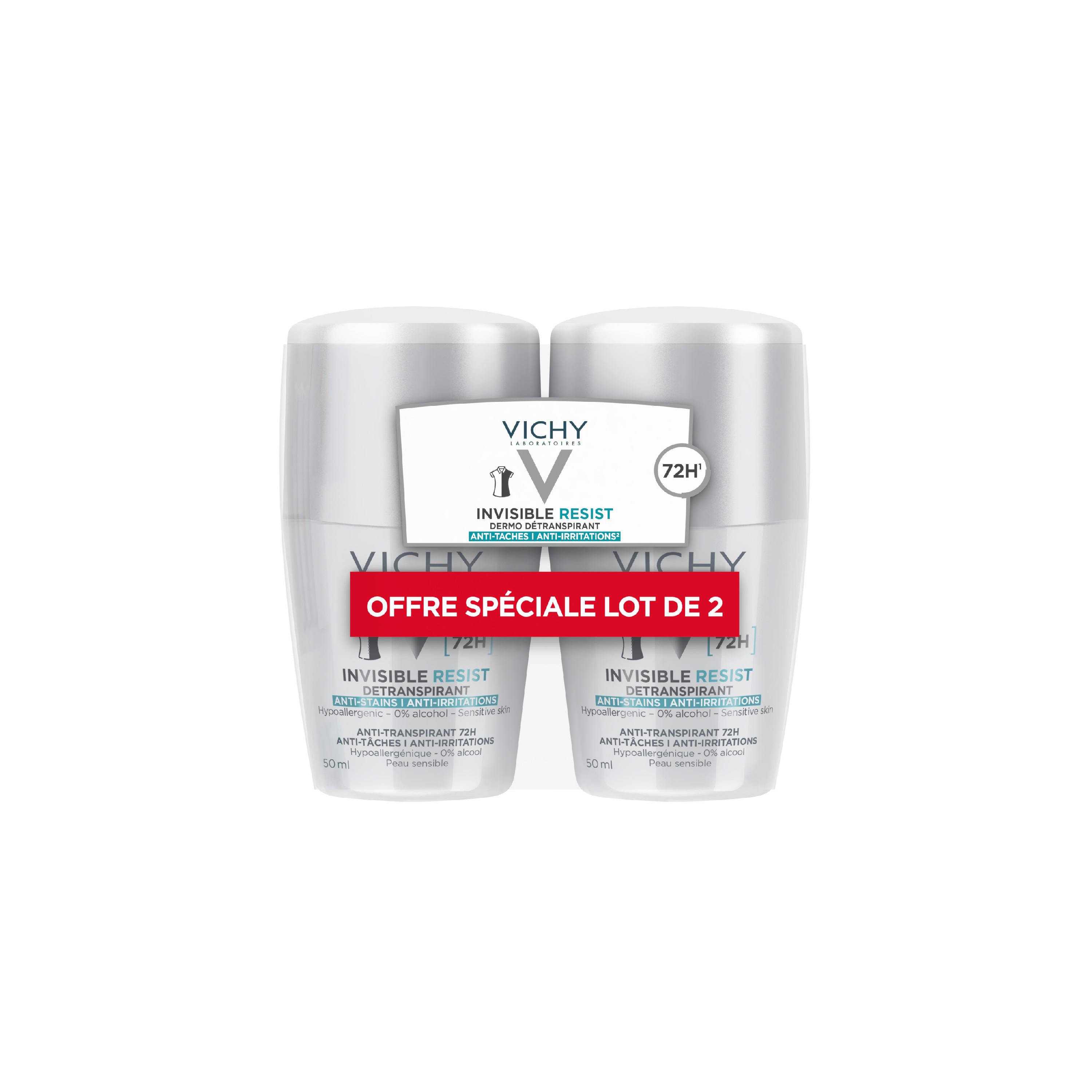 Le dermo-détranspirant Vichy Invisible Resist 72h associe efficacité grâce à son action anti-humidité et anti-odeur et une tolérance optimale avec sa formule sans alcool hypoallergénique testée sur peau sensible pour une action anti-irritations. Sa technologie Invisi-Lock approuvée par l’IFTH (Institut Français du Textile et de l’Habillement) prévient l'apparition de traces jaunes sur les textiles clairs, blanches sur les textiles foncées et des résidus qui peuvent les rigidifier. Les bénéfices de sa technologique de pointe unique est cliniquement prouvée est approuvée par 90% des utilisateurs qui le juge efficace contre les mauvaises odeurs. Efficacité 72H
