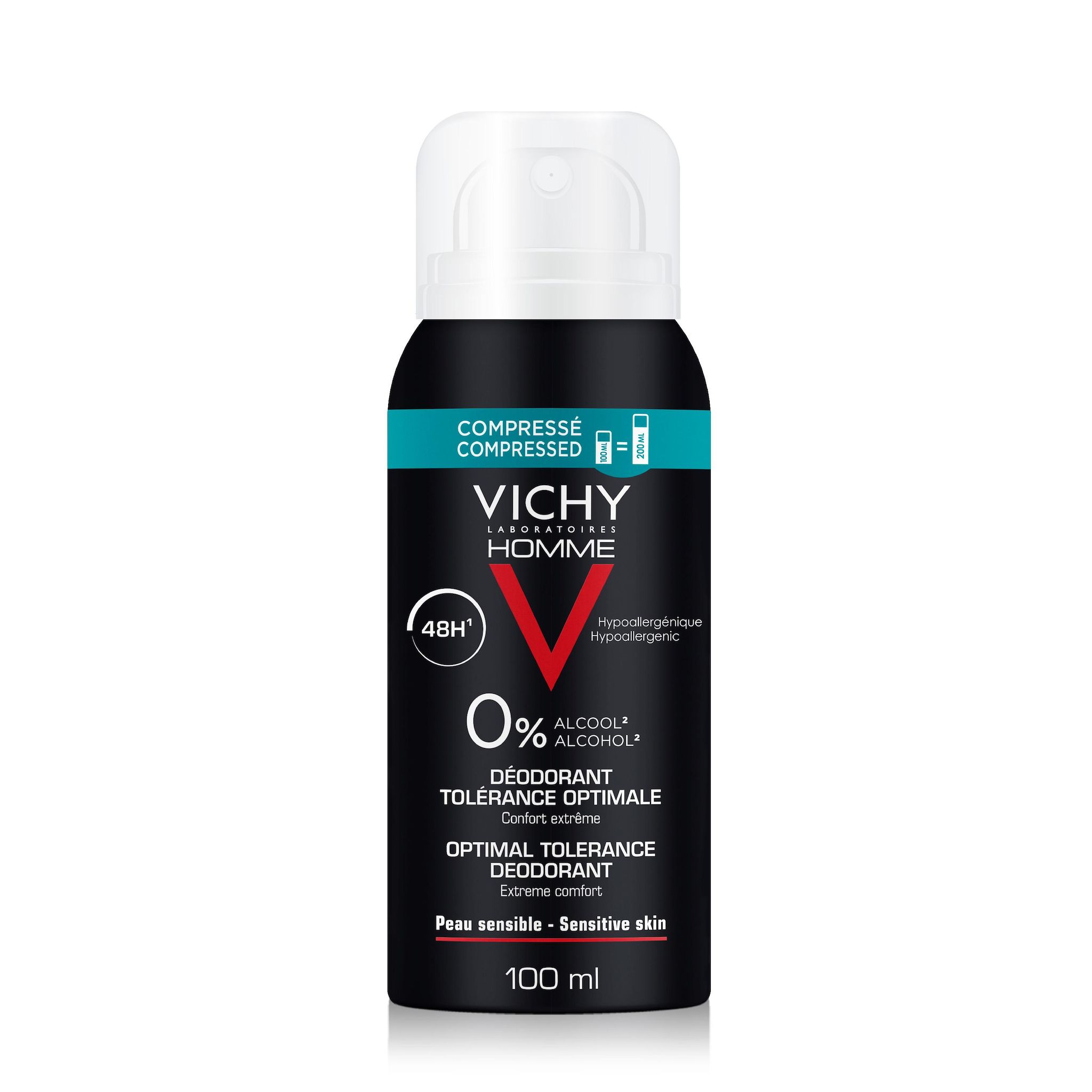 A la recherche d'un déodorant alliant efficacité 48H et tolérance optimale, sans compromis ? Découvrez Vichy Homme Tolérance Optimale, le 1er déodorant compressé Haute Tolérance par Vichy Homme. 48H de protection pour les peaux les plus sensibles, sans alcool, et avec seulement 5 ingrédients. Son format compressé 100ml garantit autant d'utilisation qu'un format 200ml. 48H de protection Confort Extrême Peau sensible