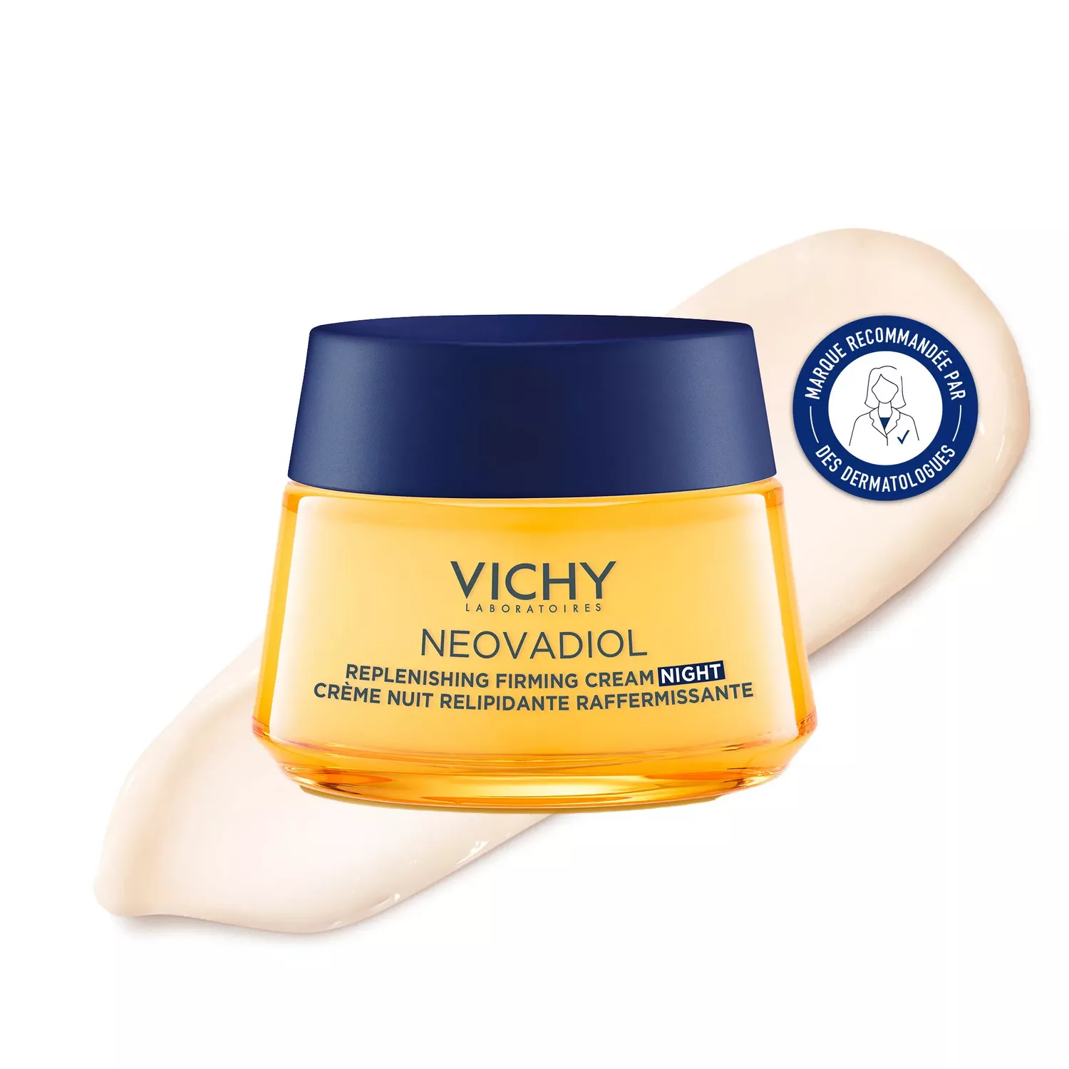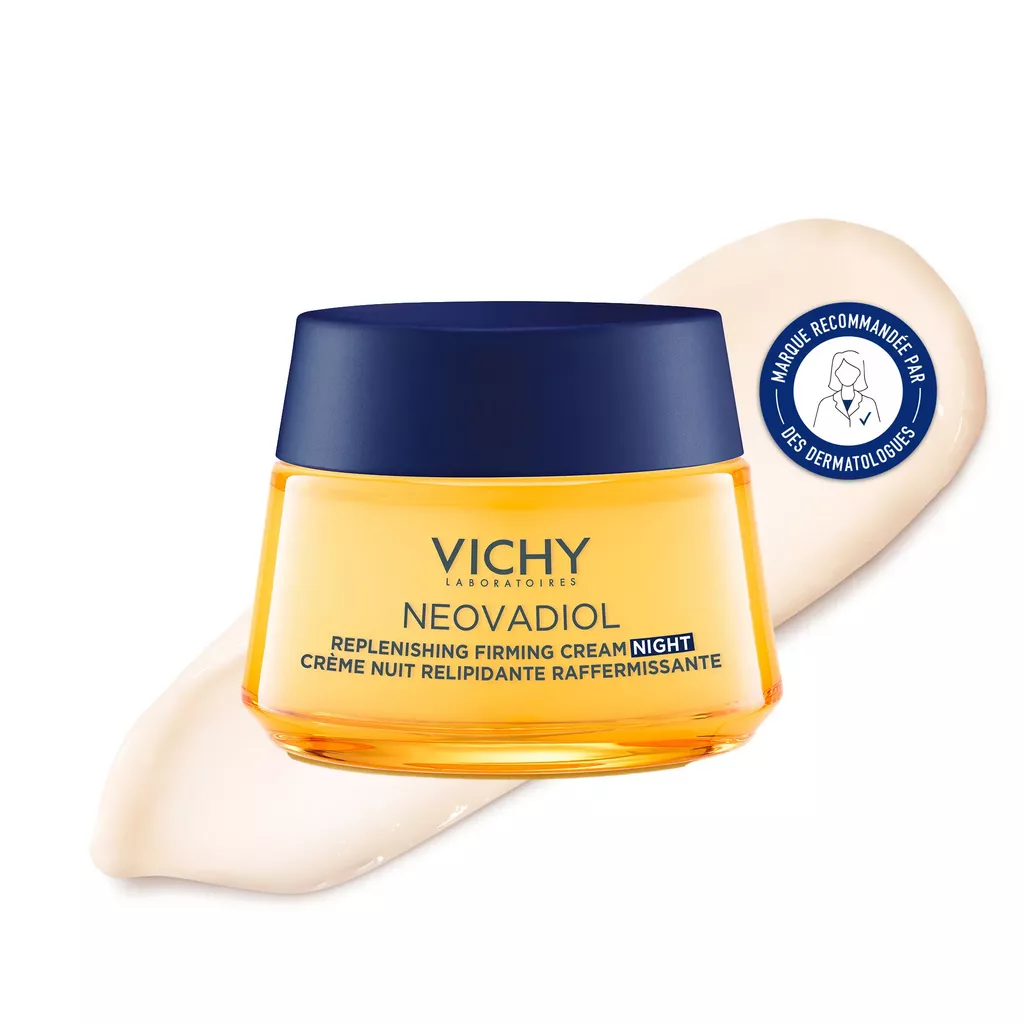 Les Laboratoires VICHY ont développé une crème nuit riche et apaisante associant l’Eau Volcanique de Vichy au Proxylane densifiant, à un extrait de Cassia, vitamine B3 apaisante et Omégas 3-6-9. Elle compense les impacts visibles de la ménopause sur la peau en comblant la perte en lipides, lissant les traits et restaurant le confort de peau. Efficacité cliniquement prouvée* : -73% sécheresse, +44% souplesse, +33% éclat *Scorage clinique sur 52 femmes après 1 mois