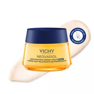 Crème nuit riche et apaisante associant Eau Volcanique de Vichy, Proxylane densifiant, extrait de Cassia, vitamine B3 apaisante et Omégas 3-6-9 relipidants. Compense les impacts de la ménopause sur la peau : comble la perte en lipides, lisse les trai