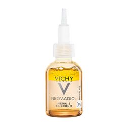 Les Laboratoires VICHY associent Eau Volcanique de Vichy, Proxylane, extrait de Cassia, trio de vitamines B3-Cg-E et trio d’Omégas 3-6-9 dans un bi-sérum qui compense les 5 impacts de la ménopause sur la peau: contours redéfinis, éclat, nutrition, an