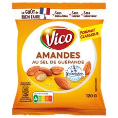 Sélectionnées pour leur saveur subtile et leur finesse, les amandes Vico sont Pour plus de plaisir, nos amandes sont accompagnés d'une pointe de sel de Guérande. Grace à leur emballage protecteur, la saveur naturelle et le croquant des ingrédients sont préservés.