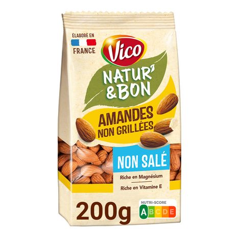 AMANDES NATURELLES NON SALEES Natur' & Bon Amandes naturelles et non salées, ce sont de véritables Amandes naturelles, non transformées, et non salées pour des instants sains et gourmands. Sans sel ajouté*, colorants, ni conservateurs, ces amandes naturelles et croquantes, sont riches en magnésium et vitamine E. Ces amandes sont source de bienfaits : de la vitamine E qui contribue à protéger les cellules contre le stress oxydatif et du magnésium qui contribue à réduire la fatigue. *la teneur en sel est exclusivement due à la présence de sodium présent naturellement dans le produit ou la graine.