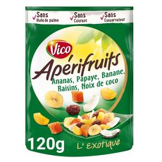 L'Apérifruits L'exotique c'est un mélange de raisins, d'ananas, de papaye, de bananes et de noix de coco. Une association gourmande de fruits colorés et savoureux pour le plus grand plaisir de vos papilles. Offrez à vos invités un moment unique de fraîcheur et d'évasion… Grâce au mélange Apérifruits Exotique et à son association gourmande de fruits colorés et savoureux, réveillez vos sens à l'apéritif!