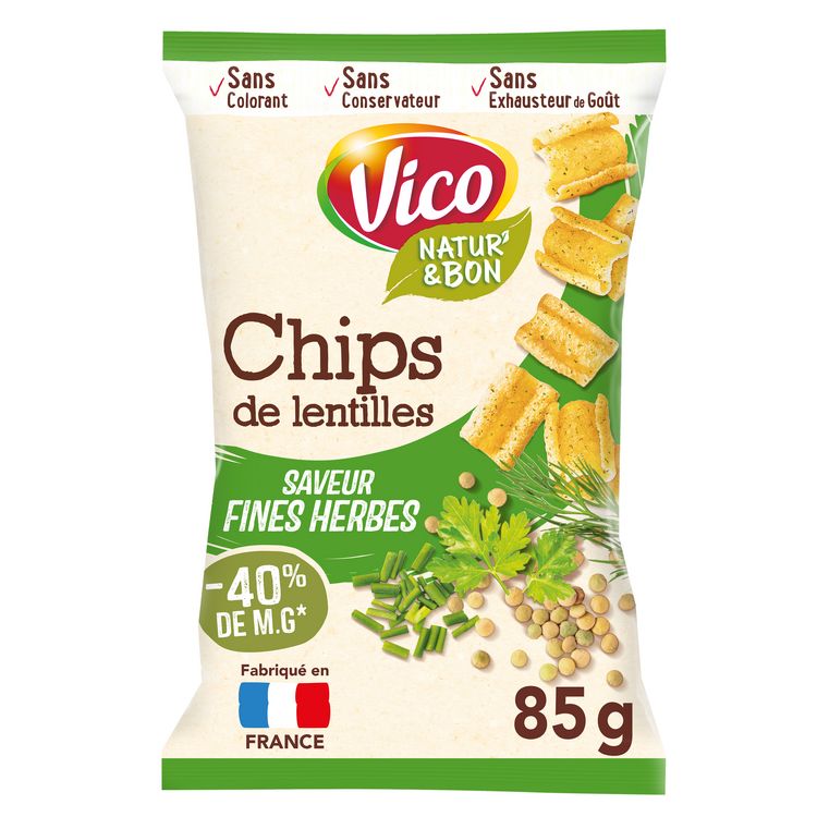 Retrouvez tout le plaisir de vos biscuits apéritifs favoris avec la gamme "chips de lentilles"; des biscuits soufflés à base de lentilles, 40% moins gras que les chips classiques, à la texture légère et croustillante pour de délicieux moments à partager. Idéal pour une petite faim dans la journée ou un apéritif entre amis.