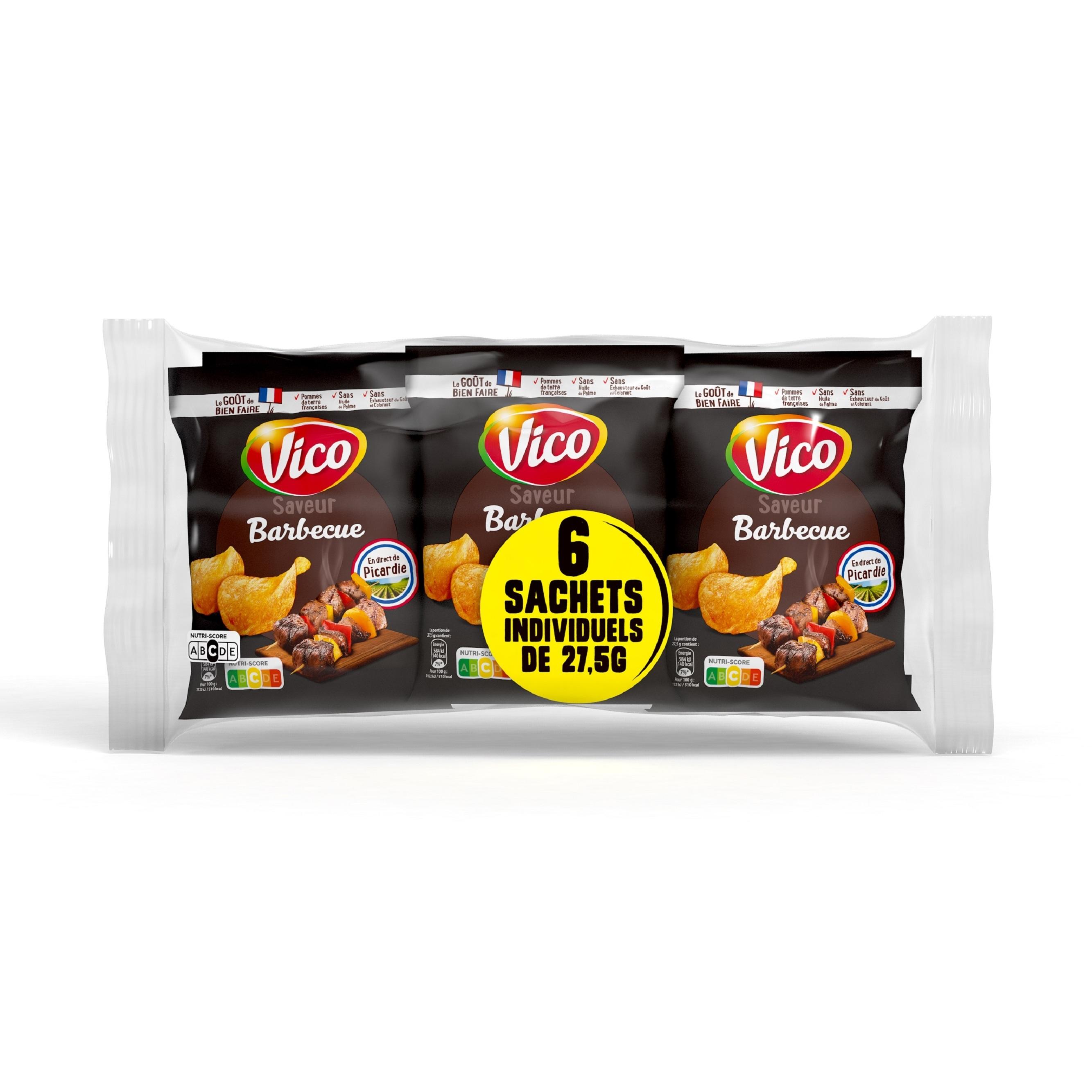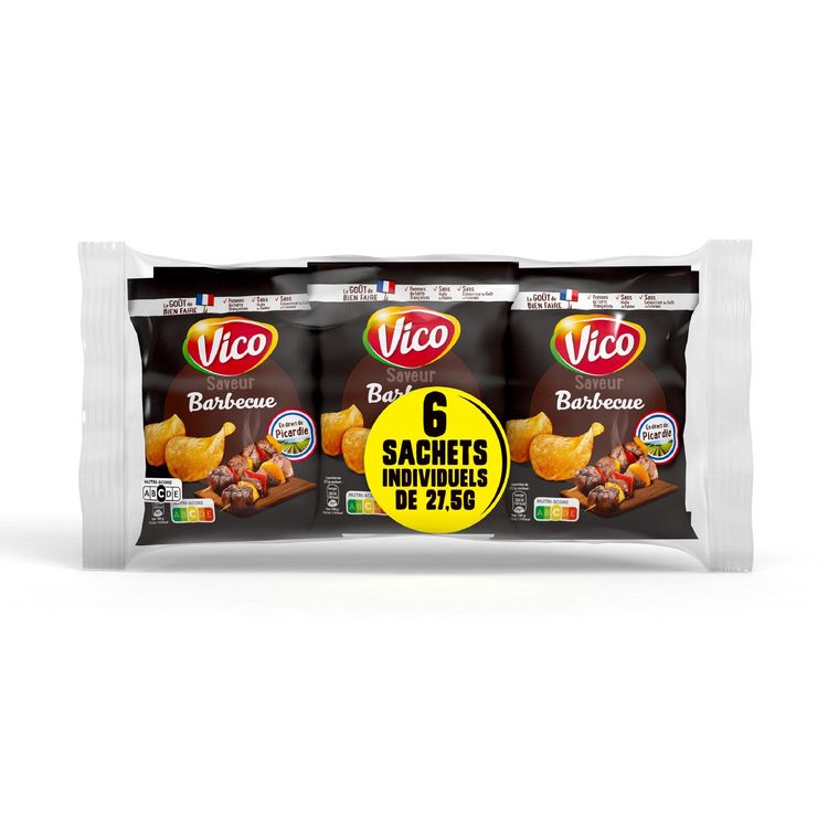 Laissez-vous tenter par les chips lisses Barbecue de VICO ! Une saveur incontournable et intensément gourmande pour un plaisir garanti ! Une recette sans exhausteur de goût, sans huile de palme, sans colorant, sans conservateur. En plus, elles sont produites en France dans l'usine VICO de Vic-sur-Aisne, à partir de pommes de terre françaises !