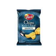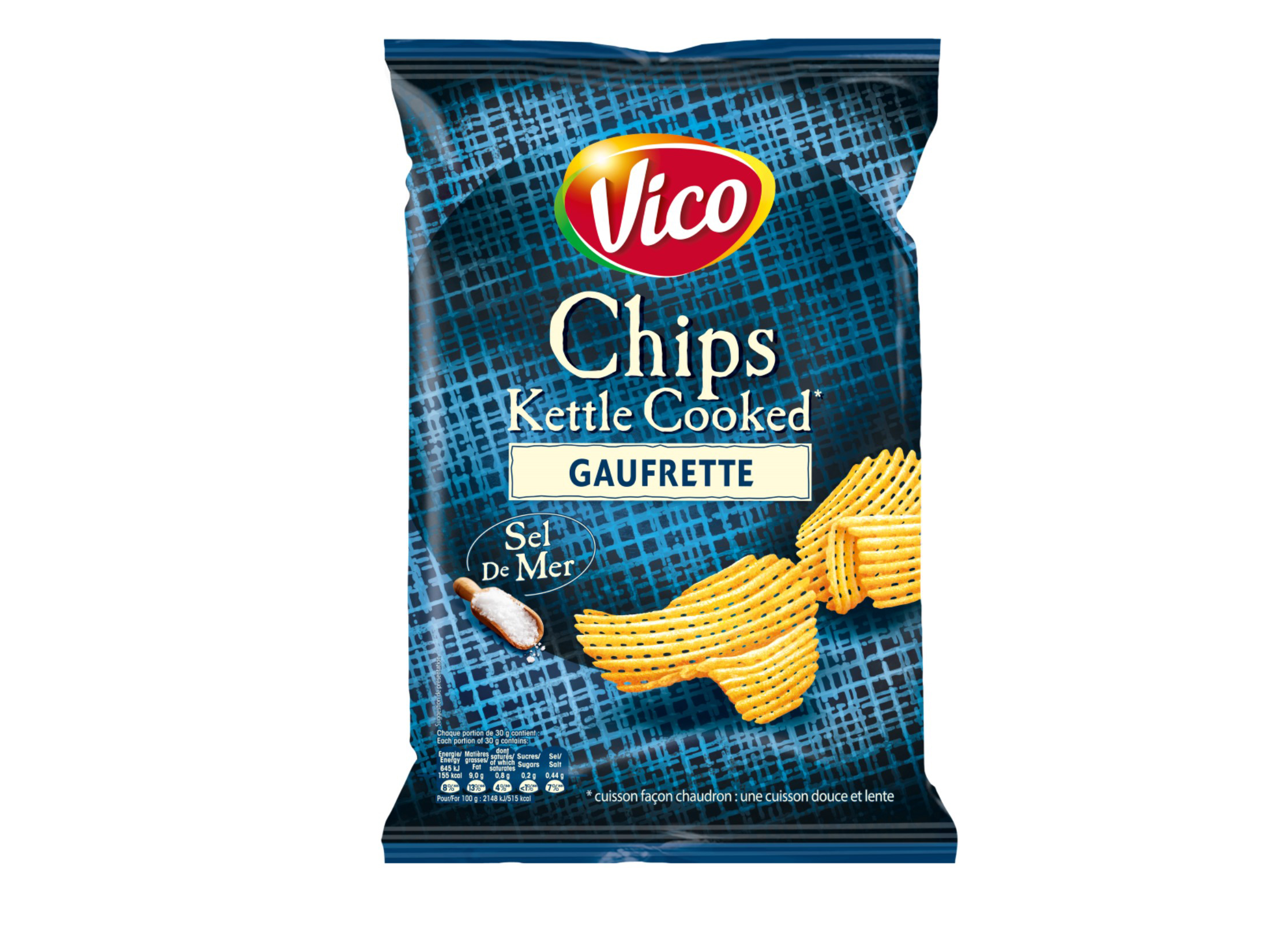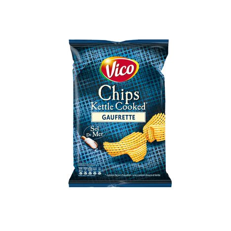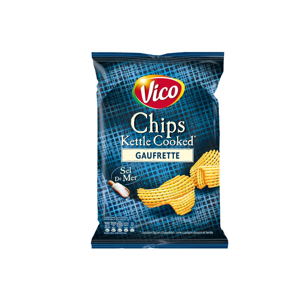 Découvrez la nouvelle coupe gaufrette sur les chips Kettle Cooked de Vico*, à la cuisson douce et lente, pour encore plus de croustillant ! *Cuisson façon chaudron : une cuisson douce et lente.